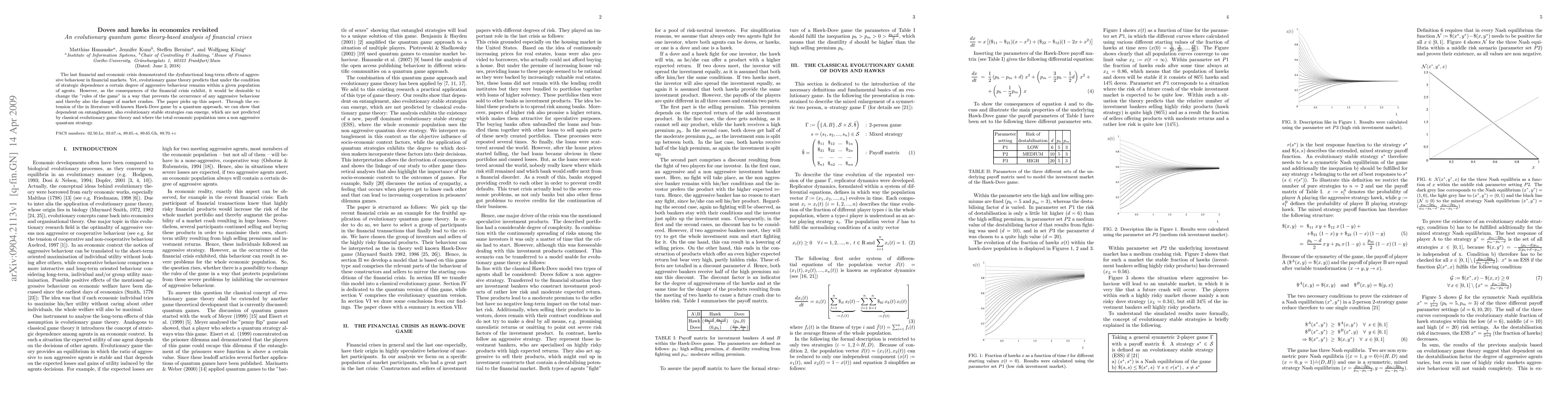 The last financial and economic crisis demonstrated the dysfunctional long-term effects of aggressive behaviour in financial markets. Yet, evolutionary game theory predicts that under the condition of strategic dependence a certain degree of aggressive behaviour remains within a given population of agents. However, as the consequences of the financial crisis exhibit, it would be desirable to change the 'rules of the game' in a way that prevents the occurrence of any aggressive behaviour and thereby also the danger of market crashes. The paper picks up this aspect. Through the extension of the in literature well-known Hawk-Dove game by a quantum approach, we can show that dependent on entanglement, also evolutionary stable strategies can emerge, which are not predicted by classical evolutionary game theory and where the total economic population uses a non aggressive quantum strategy.