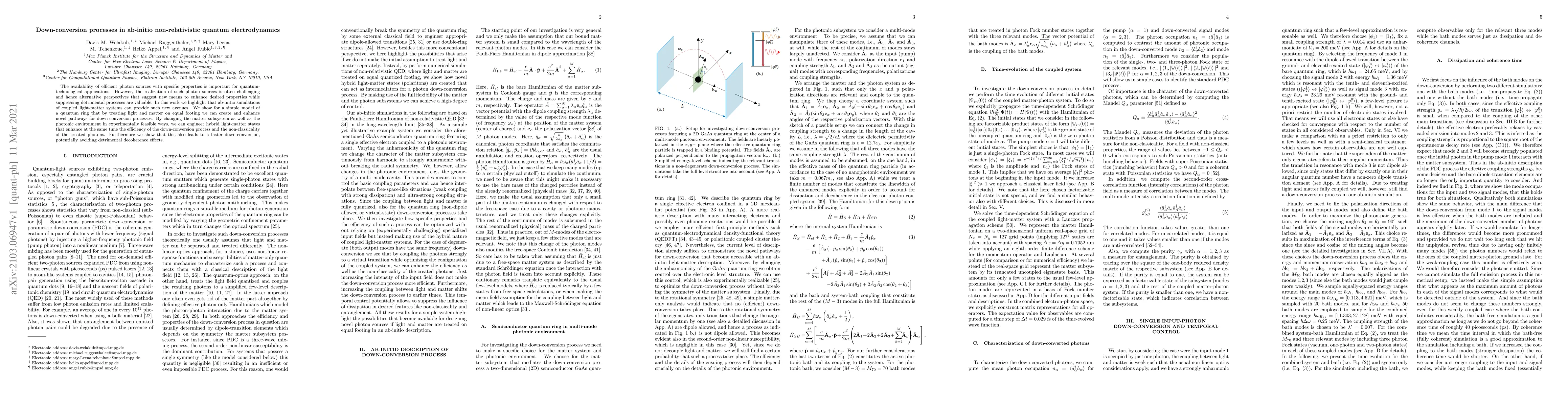 The availability of efficient photon sources with specific properties is important for quantum-technological applications. However, the realization of such photon sources is often challenging and hence alternative perspectives that suggest new means to enhance desired properties while suppressing detrimental processes are valuable. In this work we highlight that ab-initio simulations of coupled light-matter systems can provide such new avenues. We show for a simple model of a quantum ring that by treating light and matter on equal footing we can create and enhance novel pathways for down-conversion processes. By changing the matter subsystem as well as the photonic environment in experimentally feasible ways, we can engineer hybrid light-matter states that enhance at the same time the efficiency of the down-conversion process and the non-classicality of the created photons. Furthermore we show that this also leads to a faster down-conversion, potentially avoiding detrimental decoherence effects.
