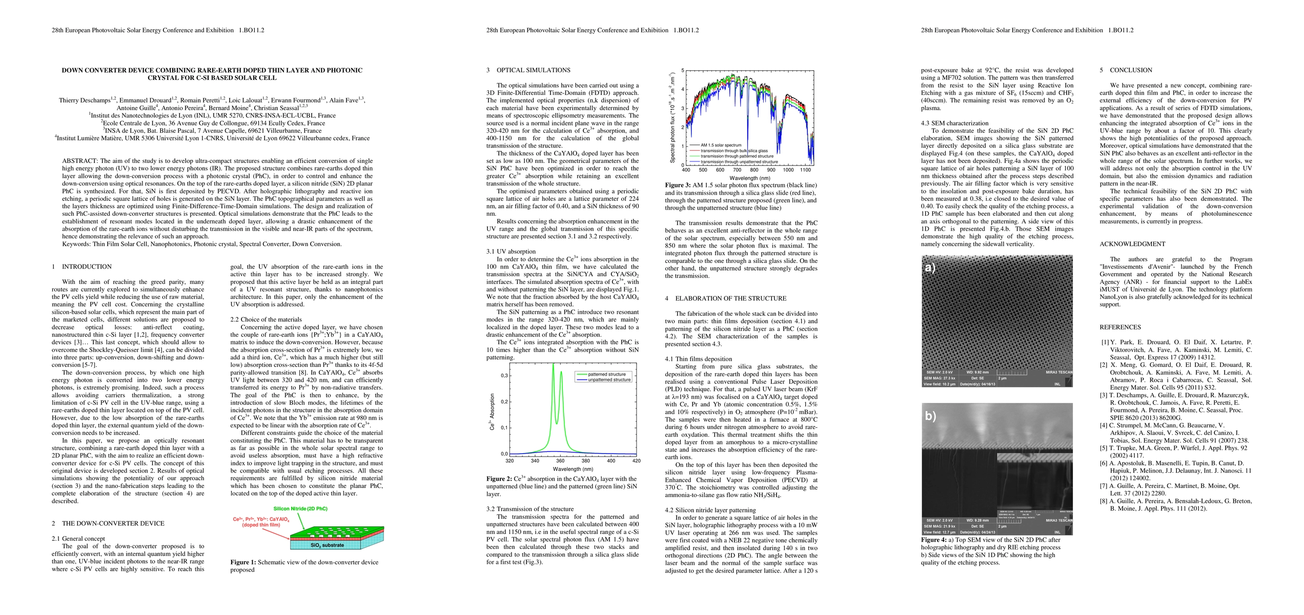 The aim of the study is to develop ultra-compact structures enabling an efficient conversion of single high energy photon (UV) to two lower energy photons (IR). The proposed structure combines rare-earths doped thin layer allowing the down-conversion process with a photonic crystal (PhC), in order to control and enhance the down-conversion using optical resonances. On the top of the rare-earths doped layer, a silicon nitride (SiN) 2D planar PhC is synthesized. For that, SiN is first deposited by PECVD. After holographic lithography and reactive ion etching, a periodic square lattice of holes is generated on the SiN layer. The PhC topographical parameters as well as the layers thickness are optimized using Finite-Difference-Time-Domain simulations. The design and realization of such PhC-assisted down-converter structures is presented. Optical simulations demonstrate that the PhC leads to the establishment of resonant modes located in the underneath doped layer, allowing a drastic enhancement of the absorption of the rare-earth ions without disturbing the transmission in the visible and near-IR parts of the spectrum, hence demonstrating the relevance of such an approach.