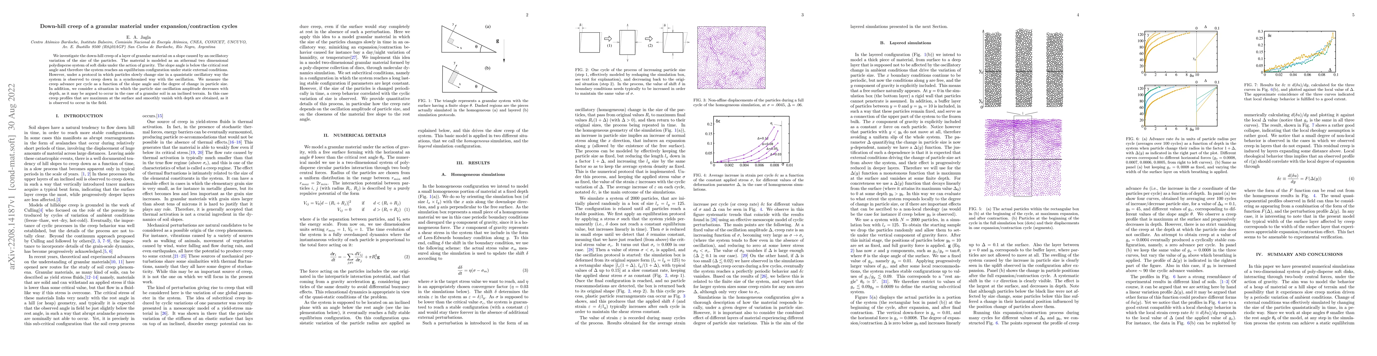 This study investigates the down-hill creep of granular material on a slope under oscillatory particle size changes, revealing synchronized creep with the oscillation. The research measures creep advance per cycle and explores scenarios where particle size oscillation amplitude decreases with depth, mirroring natural field observations.
