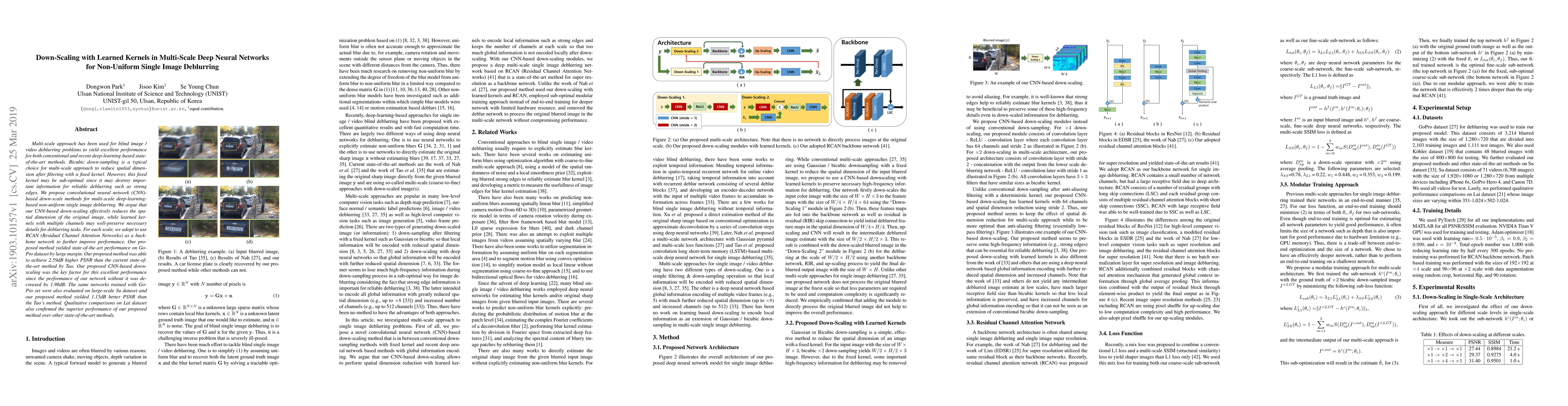 Multi-scale approach has been used for blind image / video deblurring problems to yield excellent performance for both conventional and recent deep-learning-based state-of-the-art methods. Bicubic down-sampling is a typical choice for multi-scale approach to reduce spatial dimension after filtering with a fixed kernel. However, this fixed kernel may be sub-optimal since it may destroy important information for reliable deblurring such as strong edges. We propose convolutional neural network (CNN)-based down-scale methods for multi-scale deep-learning-based non-uniform single image deblurring. We argue that our CNN-based down-scaling effectively reduces the spatial dimension of the original image, while learned kernels with multiple channels may well-preserve necessary details for deblurring tasks. For each scale, we adopt to use RCAN (Residual Channel Attention Networks) as a backbone network to further improve performance. Our proposed method yielded state-of-the-art performance on GoPro dataset by large margin. Our proposed method was able to achieve 2.59dB higher PSNR than the current state-of-the-art method by Tao. Our proposed CNN-based down-scaling was the key factor for this excellent performance since the performance of our network without it was decreased by 1.98dB. The same networks trained with GoPro set were also evaluated on large-scale Su dataset and our proposed method yielded 1.15dB better PSNR than the Tao's method. Qualitative comparisons on Lai dataset also confirmed the superior performance of our proposed method over other state-of-the-art methods.