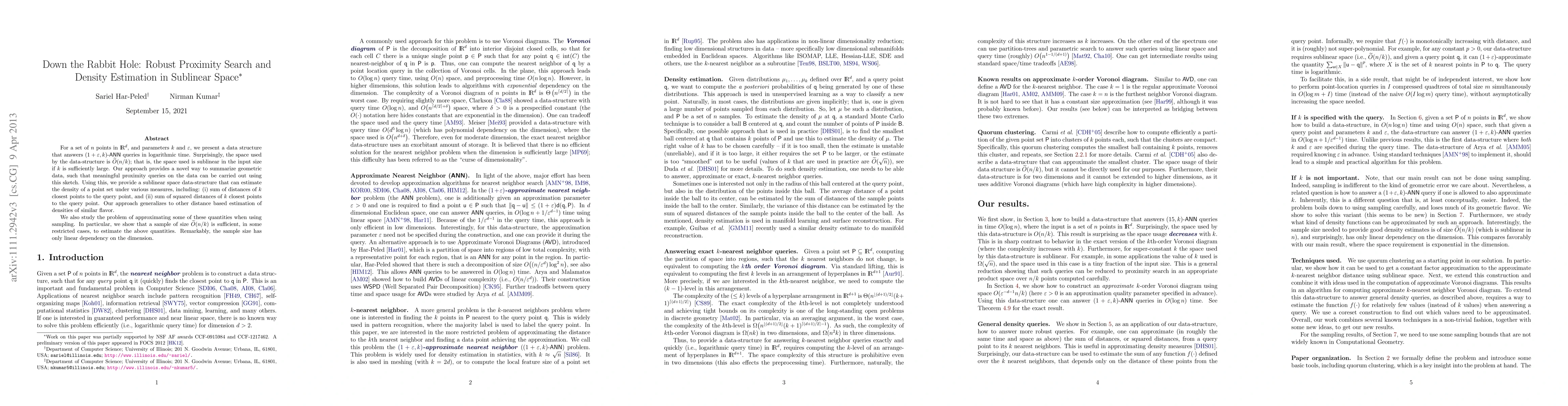 For a set of $n$ points in $\Re^d$, and parameters $k$ and $\eps$, we present a data structure that answers $(1+\eps,k)$-\ANN queries in logarithmic time. Surprisingly, the space used by the data-structure is $\Otilde (n /k)$; that is, the space used is sublinear in the input size if $k$ is sufficiently large. Our approach provides a novel way to summarize geometric data, such that meaningful proximity queries on the data can be carried out using this sketch. Using this, we provide a sublinear space data-structure that can estimate the density of a point set under various measures, including: \begin{inparaenum}[(i)] \item sum of distances of $k$ closest points to the query point, and \item sum of squared distances of $k$ closest points to the query point. \end{inparaenum} Our approach generalizes to other distance based estimation of densities of similar flavor. We also study the problem of approximating some of these quantities when using sampling. In particular, we show that a sample of size $\Otilde (n /k)$ is sufficient, in some restricted cases, to estimate the above quantities. Remarkably, the sample size has only linear dependency on the dimension.