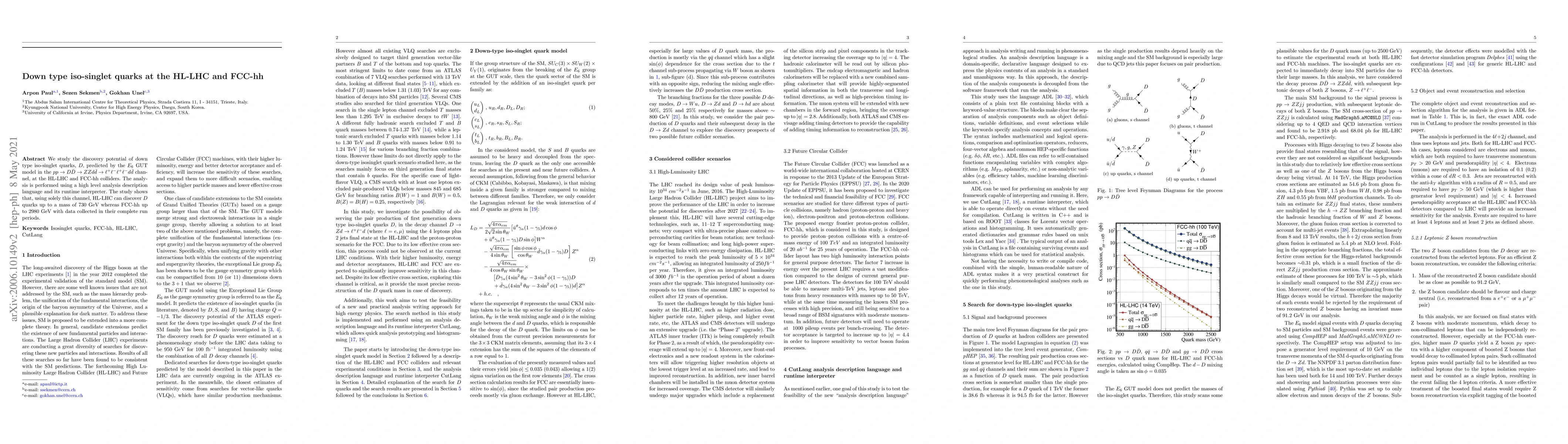 This paper investigates the potential discovery of down type iso-singlet quarks, $D$, predicted by the $E_6$ GUT model at the HL-LHC and FCC-hh colliders. The study finds that HL-LHC can discover these quarks up to 710 GeV, while FCC-hh can extend this limit to 2430 GeV using the $pp\rightarrow D\bar{D}\rightarrow ZZd\bar{d}$ decay channel.