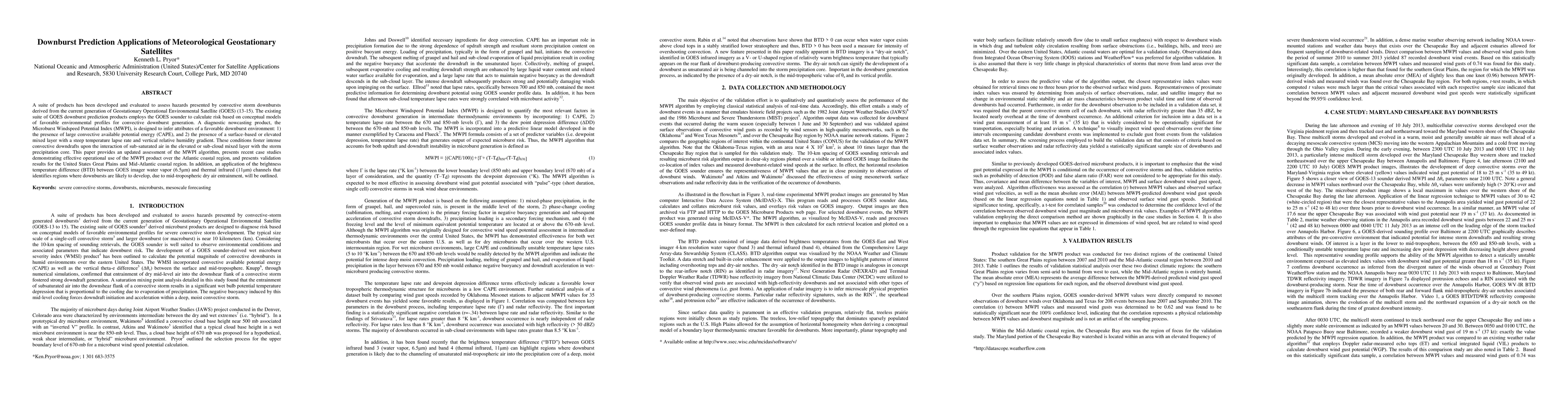 This paper evaluates downburst prediction tools from Geostationary Operational Environmental Satellites (GOES), focusing on the Microburst Windspeed Potential Index (MWPI) and its operational use. It also introduces a brightness temperature difference method to identify potential downburst regions due to mid-tropospheric dry air entrainment.