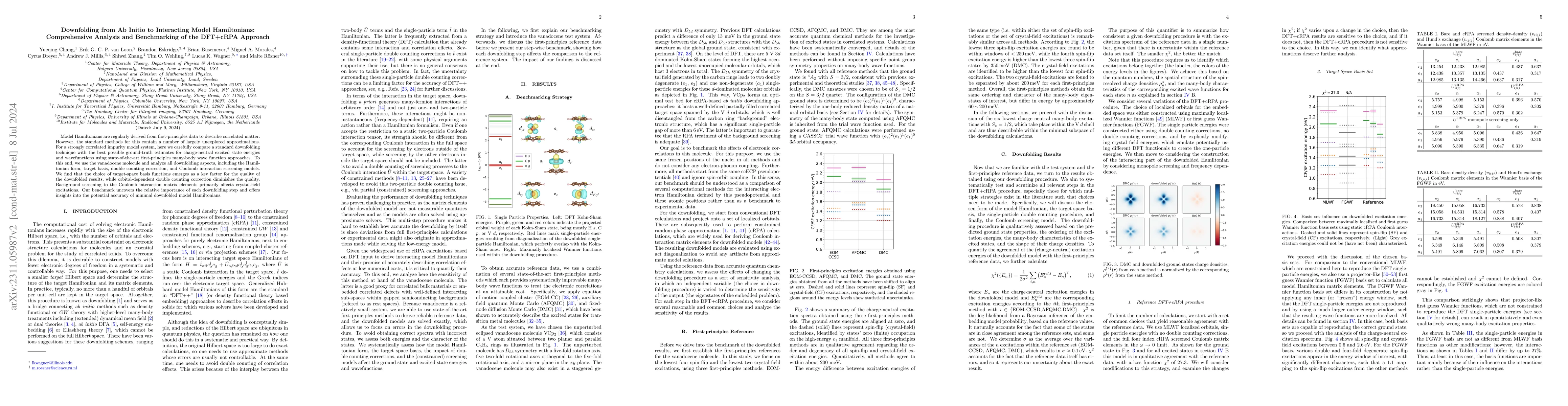This paper benchmarks various downfolding techniques for deriving model Hamiltonians from first-principles data, using vanadocene as a model system. It finds that the choice of target-space basis functions significantly impacts the accuracy of downfolded results, while double counting correction and Coulomb interaction screening have more nuanced effects.