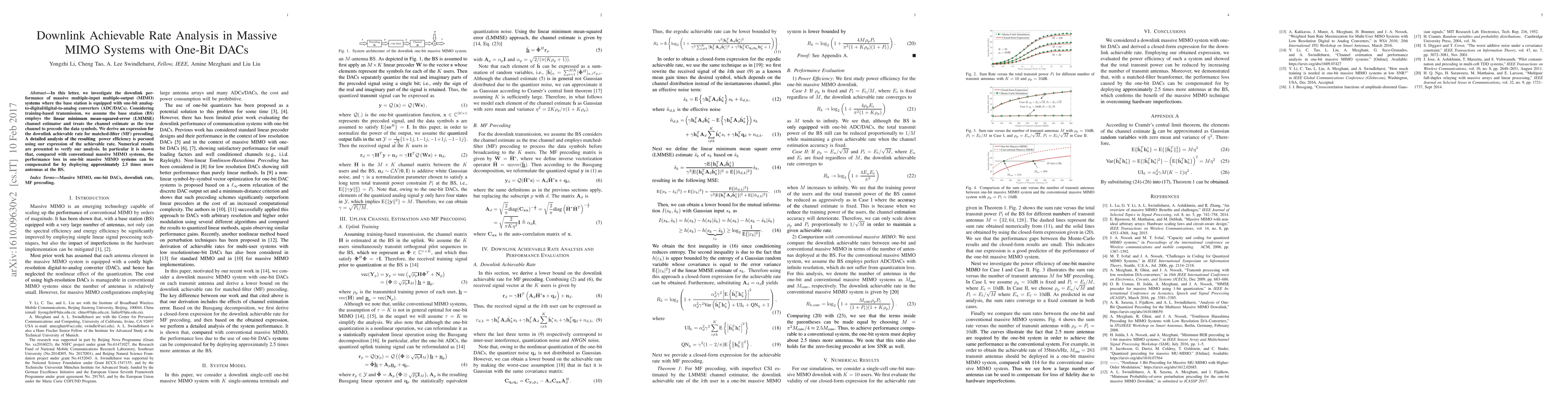This paper analyzes the downlink achievable rate in massive MIMO systems using one-bit DACs, deriving an expression for matched-filter precoding and examining power efficiency. Numerical results show that deploying 2.5 times more antennas can compensate for performance loss compared to conventional systems.