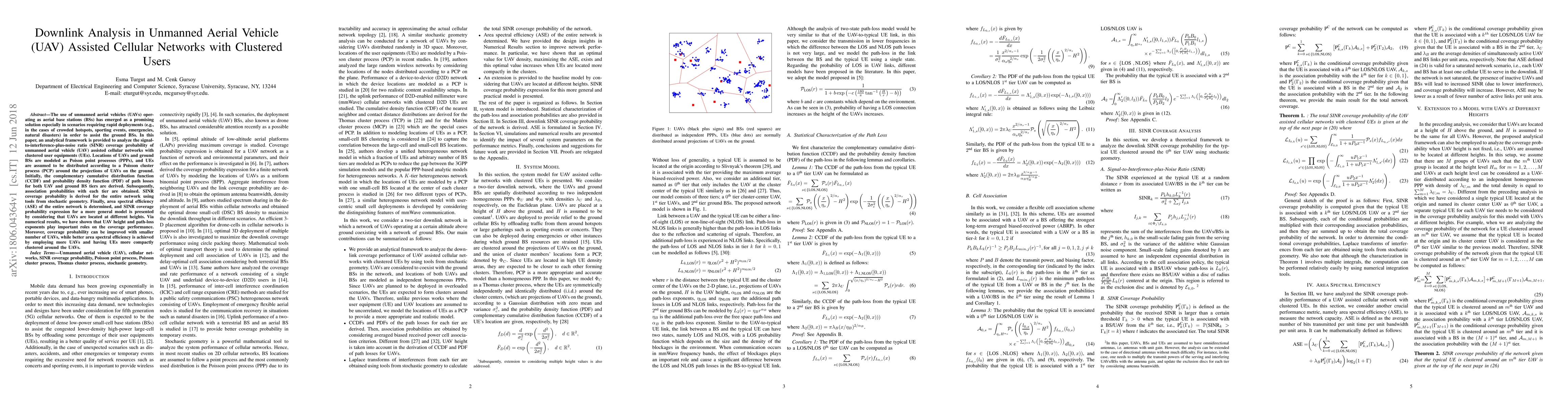 This paper develops an analytical framework to evaluate the signal-to-interference-plus-noise ratio (SINR) coverage probability in UAV-assisted cellular networks with clustered users. It models UAVs and ground base stations as Poisson point processes and users as Poisson cluster processes, deriving SINR and area spectral efficiency metrics, and demonstrating that UAV height and clustering affect coverage performance.