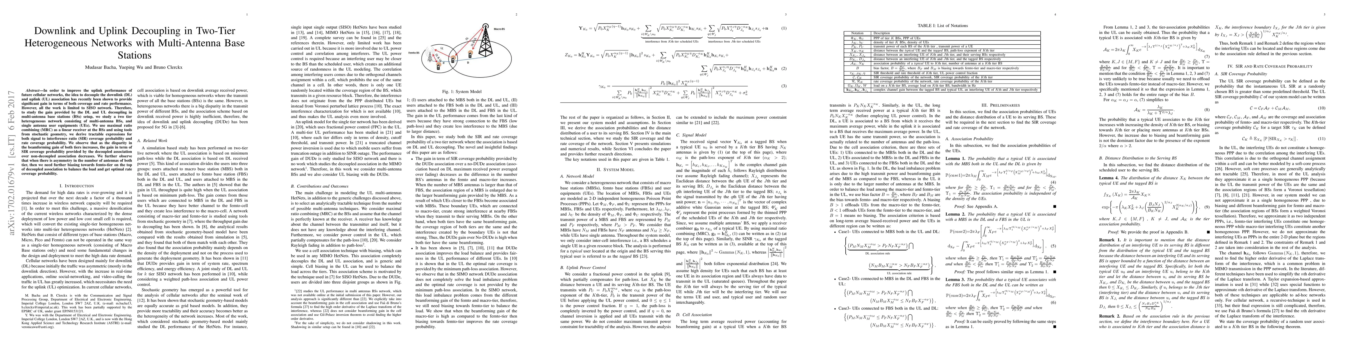 This paper investigates the benefits of decoupling downlink and uplink associations in two-tier heterogeneous networks with multi-antenna base stations. It finds that while decoupling improves performance, the gain diminishes with increased disparity in beamforming gain, and optimal rate coverage requires additional biasing towards femto-tiers when antenna counts differ.