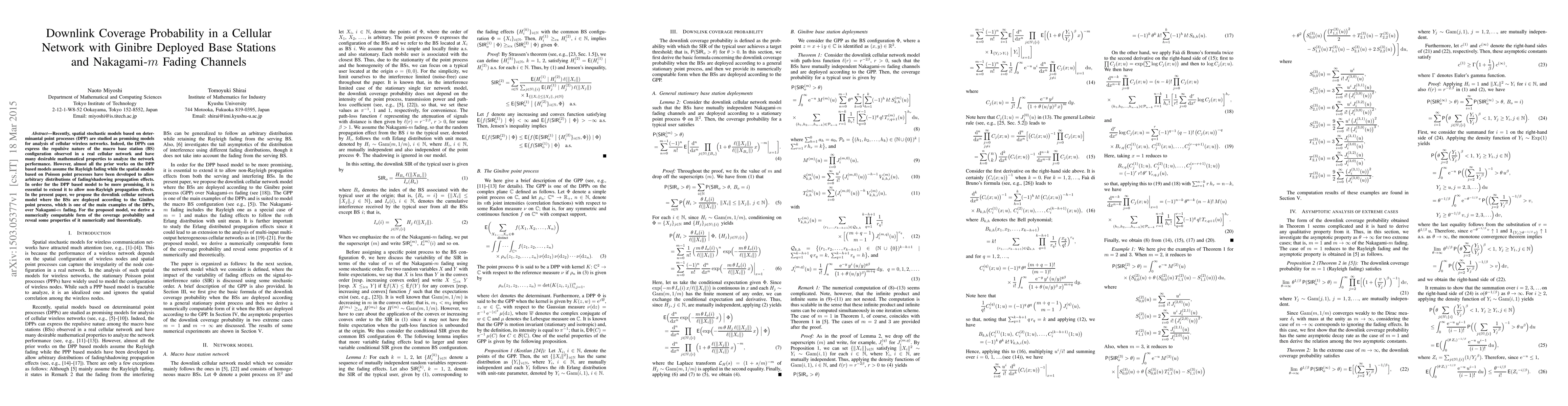 This paper proposes a cellular network model with base stations deployed via the Ginibre point process and Nakagami-m fading channels, extending determinantal point process models beyond Rayleigh fading. It derives a numerically computable coverage probability and explores its properties both theoretically and numerically.