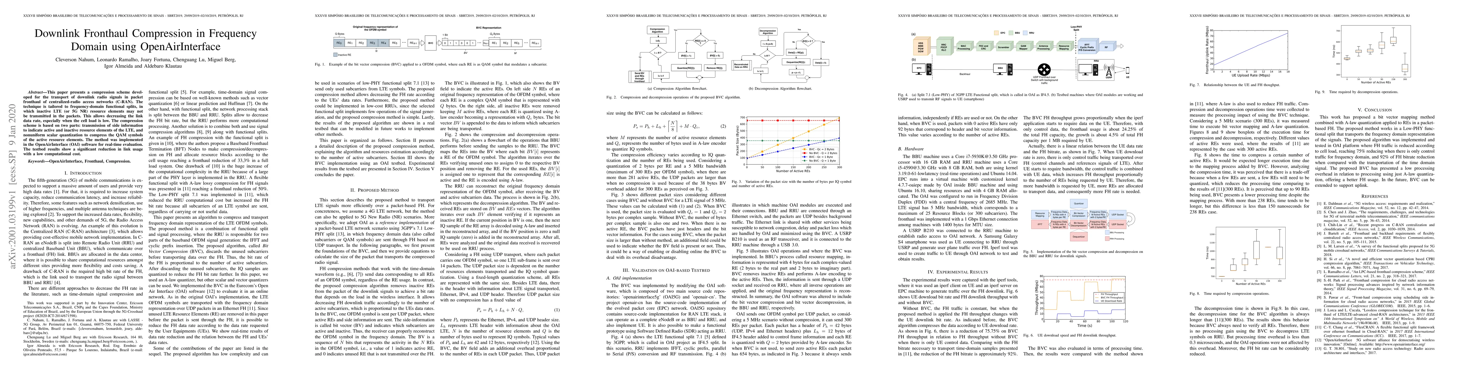 This paper presents a compression scheme developed for the transport of downlink radio signals in packet fronthaul of centralized-radio access networks (C-RAN). The technique is tailored to frequency-domain functional splits, in which inactive LTE (or 5G NR) resource elements may not be transmitted in the packets. This allows decreasing the link data rate, especially when the cell load is low. The compression scheme is based on two parts: transmission of side information to indicate active and inactive resource elements of the LTE, and nonuniform scalar quantization to compress the QAM symbols of the active resource elements. The method was implemented in the OpenAirInterface (OAI) software for real-time evaluation. The testbed results show a significant reduction in link usage with a low computational cost.