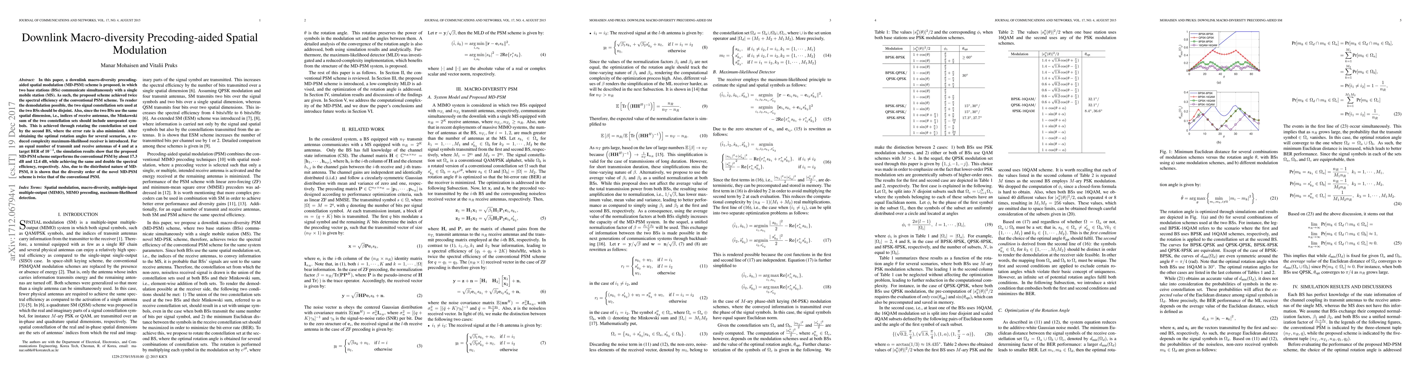 This paper proposes a Downlink Macro-diversity Precoding aided Spatial Modulation (MD-PSM) scheme, enhancing spectral efficiency by 100% compared to conventional PSM. Using two BSs to communicate with one MS, it ensures disjoint constellation sets and optimal rotation angles for minimal error rate. Simulations show MD-PSM outperforms PSM by 17.3 dB and 12.4 dB for same and double spectral efficiency, respectively, with doubled diversity order.