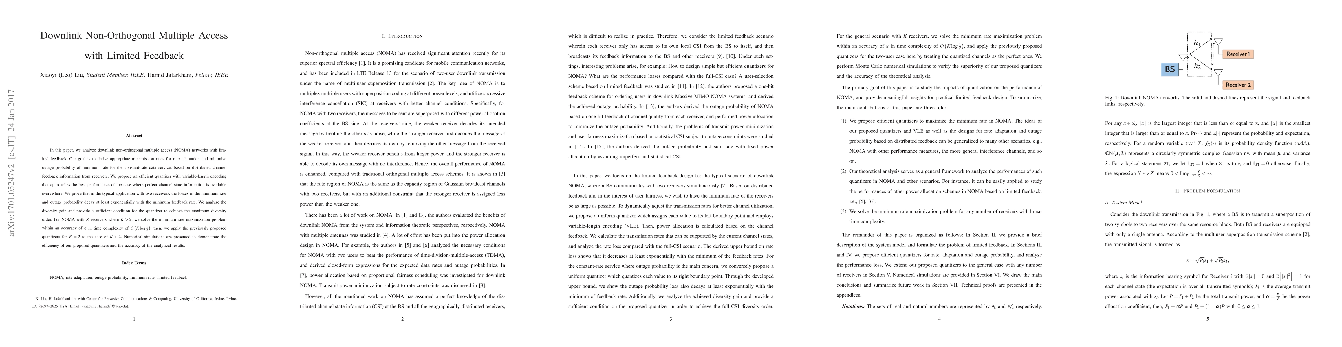 In this paper, we analyze downlink non-orthogonal multiple access (NOMA) networks with limited feedback. Our goal is to derive appropriate transmission rates for rate adaptation and minimize outage probability of minimum rate for the constant-rate data service, based on distributed channel feedback information from receivers. We propose an efficient quantizer with variable-length encoding that approaches the best performance of the case where perfect channel state information is available everywhere. We prove that in the typical application with two receivers, the losses in the minimum rate and outage probability decay at least exponentially with the minimum feedback rate. We analyze the diversity gain and provide a sufficient condition for the quantizer to achieve the maximum diversity order. For NOMA with $K$ receivers where $K > 2$, we solve the minimum rate maximization problem within an accuracy of $\epsilon$ in time complexity of $O\left(K\log\frac{1}{\epsilon}\right)$, then, we apply the previously proposed quantizers for $K = 2$ to the case of $K > 2$. Numerical simulations are presented to demonstrate the efficiency of our proposed quantizers and the accuracy of the analytical results.