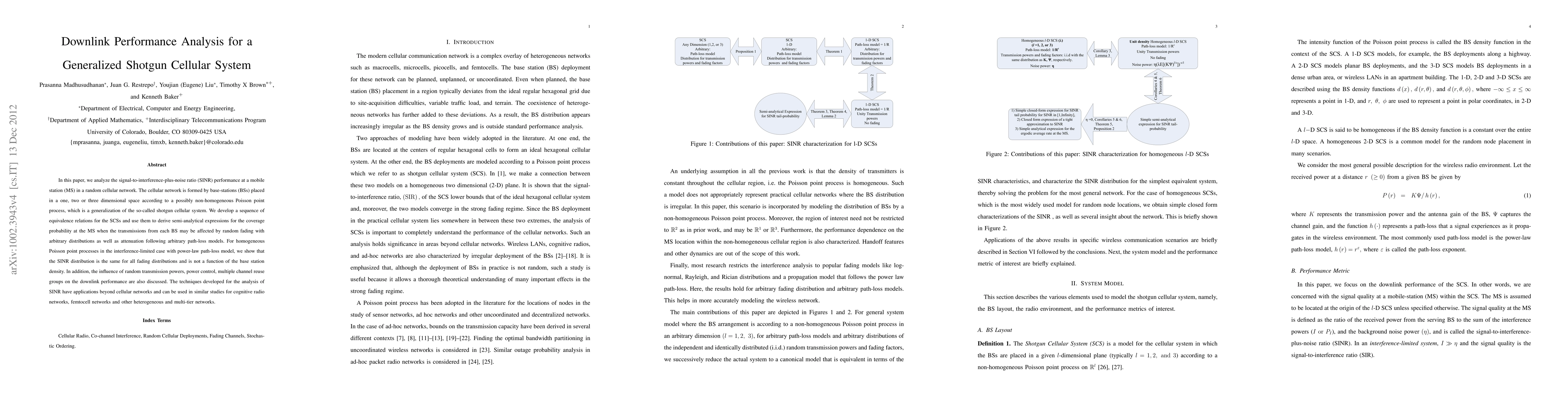 In this paper, we analyze the signal-to-interference-plus-noise ratio (SINR) performance at a mobile station (MS) in a random cellular network. The cellular network is formed by base-stations (BSs) placed in a one, two or three dimensional space according to a possibly non-homogeneous Poisson point process, which is a generalization of the so-called shotgun cellular system. We develop a sequence of equivalence relations for the SCSs and use them to derive semi-analytical expressions for the coverage probability at the MS when the transmissions from each BS may be affected by random fading with arbitrary distributions as well as attenuation following arbitrary path-loss models. For homogeneous Poisson point processes in the interference-limited case with power-law path-loss model, we show that the SINR distribution is the same for all fading distributions and is not a function of the base station density. In addition, the influence of random transmission powers, power control, multiple channel reuse groups on the downlink performance are also discussed. The techniques developed for the analysis of SINR have applications beyond cellular networks and can be used in similar studies for cognitive radio networks, femtocell networks and other heterogeneous and multi-tier networks.