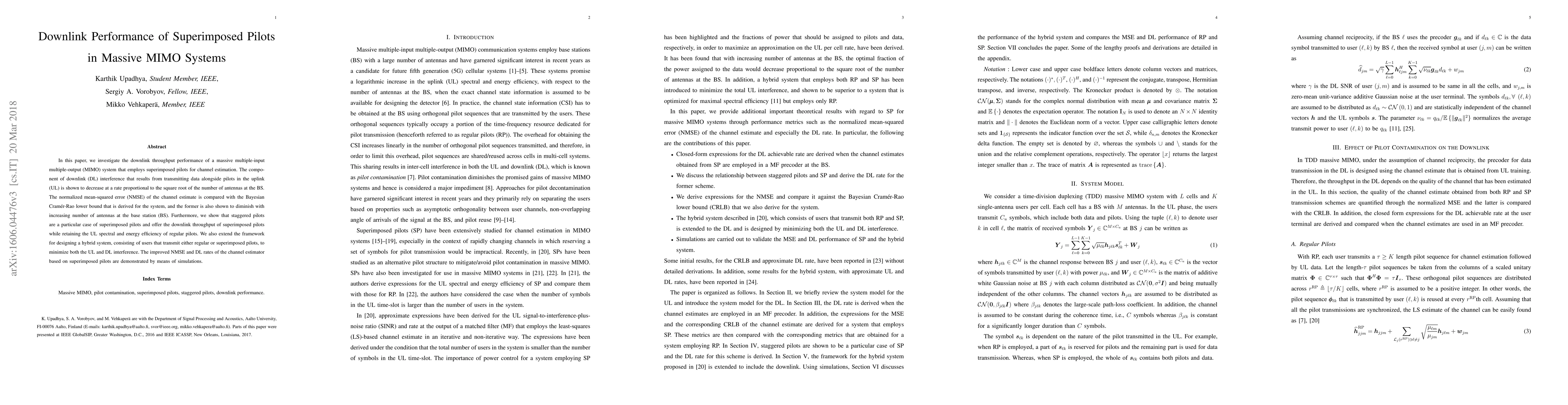 In this paper, we investigate the downlink throughput performance of a massive multiple-input multiple-output (MIMO) system that employs superimposed pilots for channel estimation. The component of downlink (DL) interference that results from transmitting data alongside pilots in the uplink (UL) is shown to decrease at a rate proportional to the square root of the number of antennas at the BS. The normalized mean-squared error (NMSE) of the channel estimate is compared with the Bayesian Cram\'{e}r-Rao lower bound that is derived for the system, and the former is also shown to diminish with increasing number of antennas at the base station (BS). Furthermore, we show that staggered pilots are a particular case of superimposed pilots and offer the downlink throughput of superimposed pilots while retaining the UL spectral and energy efficiency of regular pilots. We also extend the framework for designing a hybrid system, consisting of users that transmit either regular or superimposed pilots, to minimize both the UL and DL interference. The improved NMSE and DL rates of the channel estimator based on superimposed pilots are demonstrated by means of simulations.