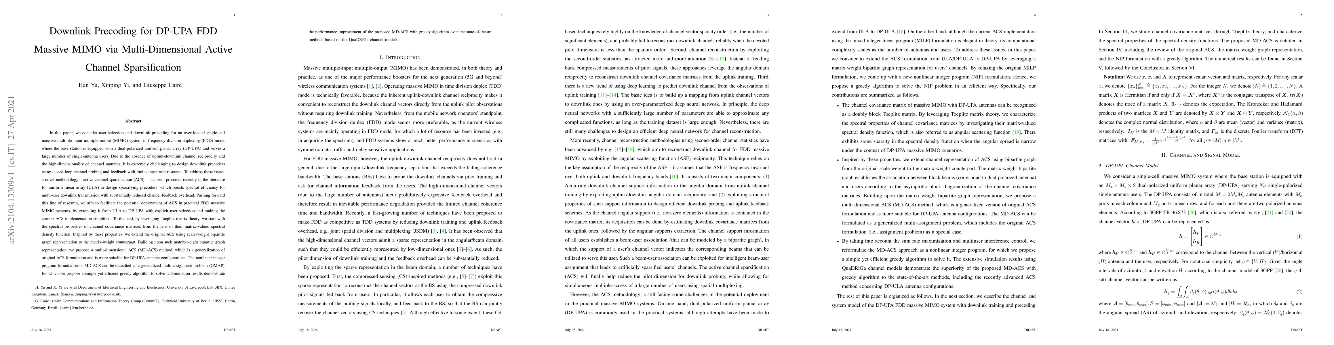 This paper proposes a multi-dimensional active channel sparsification (MD-ACS) method for downlink precoding in DP-UPA FDD massive MIMO systems, extending the original ACS from ULA to DP-UPA. It introduces a simplified greedy algorithm to solve the generalized multi-assignment problem, demonstrating performance improvements over state-of-the-art methods.