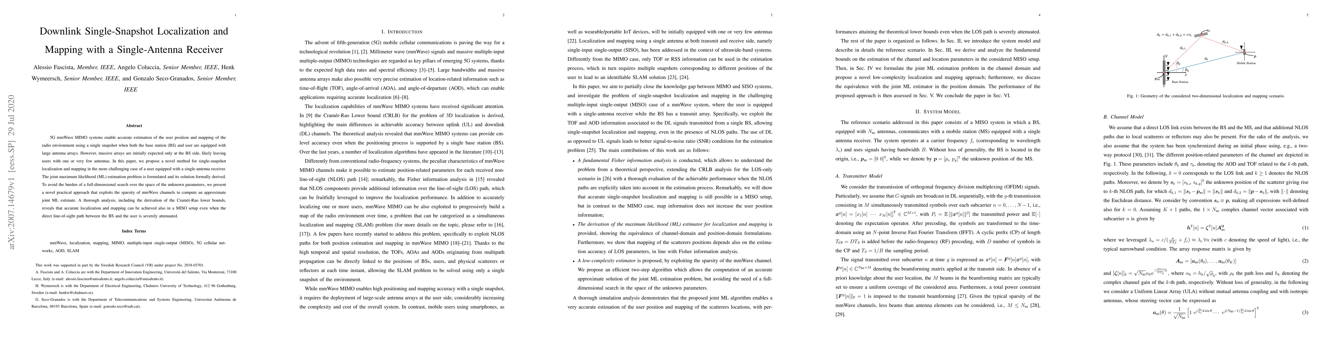 This paper proposes a novel method for single-snapshot localization and mapping in 5G mmWave MIMO systems where users have only a single-antenna receiver, leveraging the sparsity of mmWave channels to achieve accurate results despite severe attenuation of direct line-of-sight paths. The method formulates a joint maximum likelihood estimation problem and derives an approximate solution to avoid full-dimensional search.