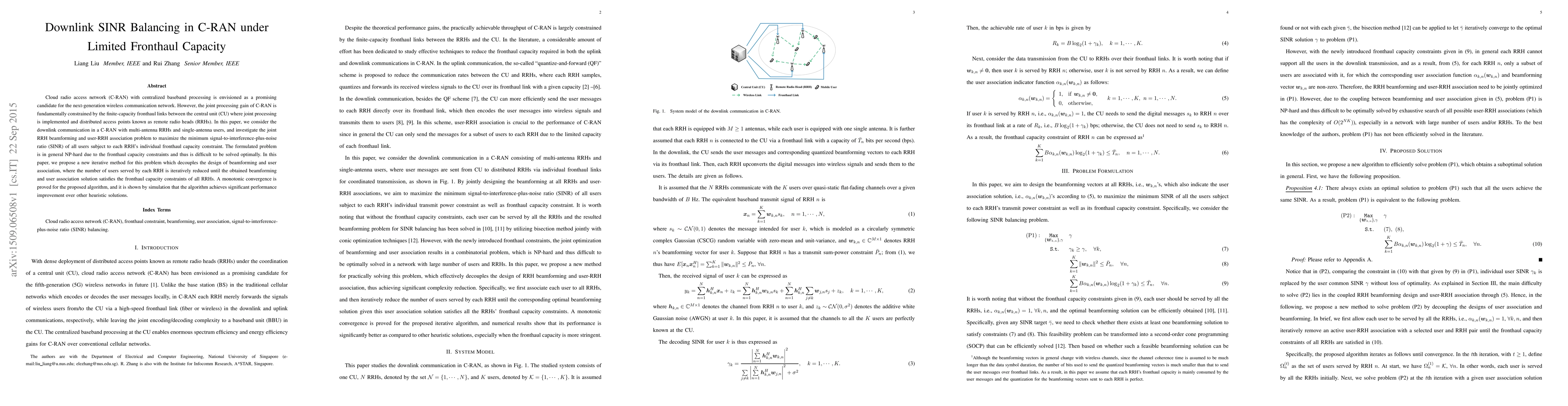 This paper proposes an iterative method for balancing signal-to-interference-plus-noise ratio (SINR) in downlink C-RAN under fronthaul capacity constraints, decoupling beamforming and user association to achieve optimal user coverage within capacity limits. The method iteratively reduces users per remote radio head (RRH) until fronthaul constraints are met, demonstrating superior performance compared to heuristics.