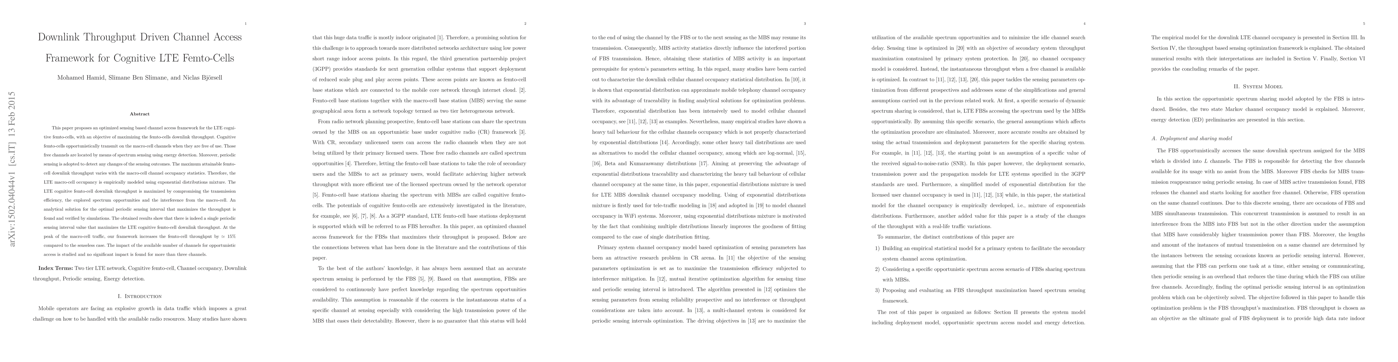 This paper proposes an optimized sensing-based channel access framework for LTE cognitive femto-cells to maximize downlink throughput by opportunistically using macro-cell channels when they are free, with an analytical solution for the optimal sensing interval. The framework increases femto-cell throughput by around 15% during peak macro-cell traffic.