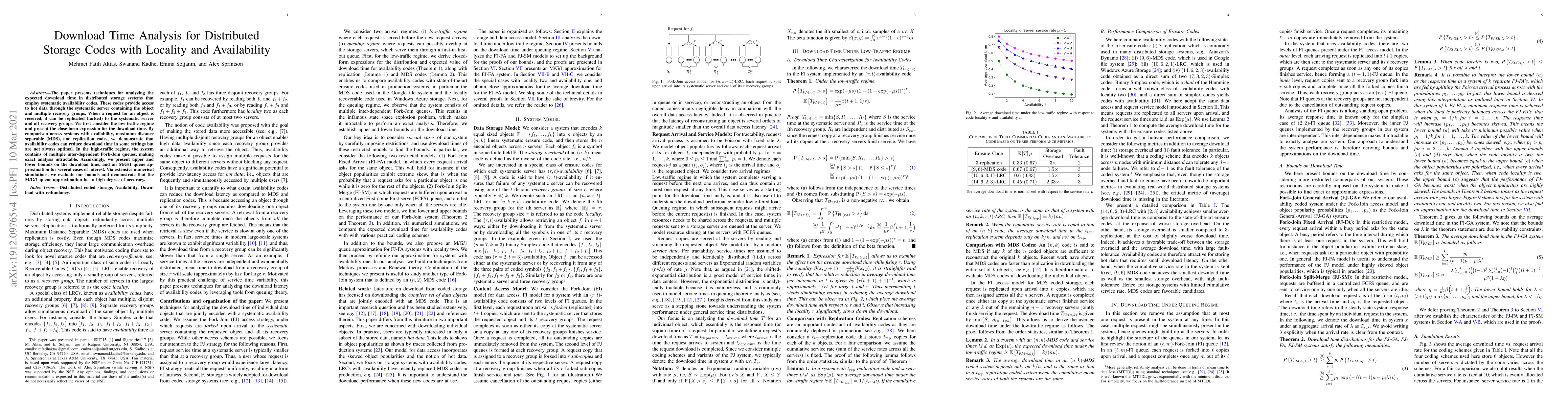 This paper analyzes download times in distributed storage systems using systematic availability codes, showing they can reduce download time under low-traffic conditions but may not be optimal in all scenarios. For high-traffic conditions, the paper provides upper and lower bounds on download time and validates an M/G/1 queue approximation through numerical simulations.