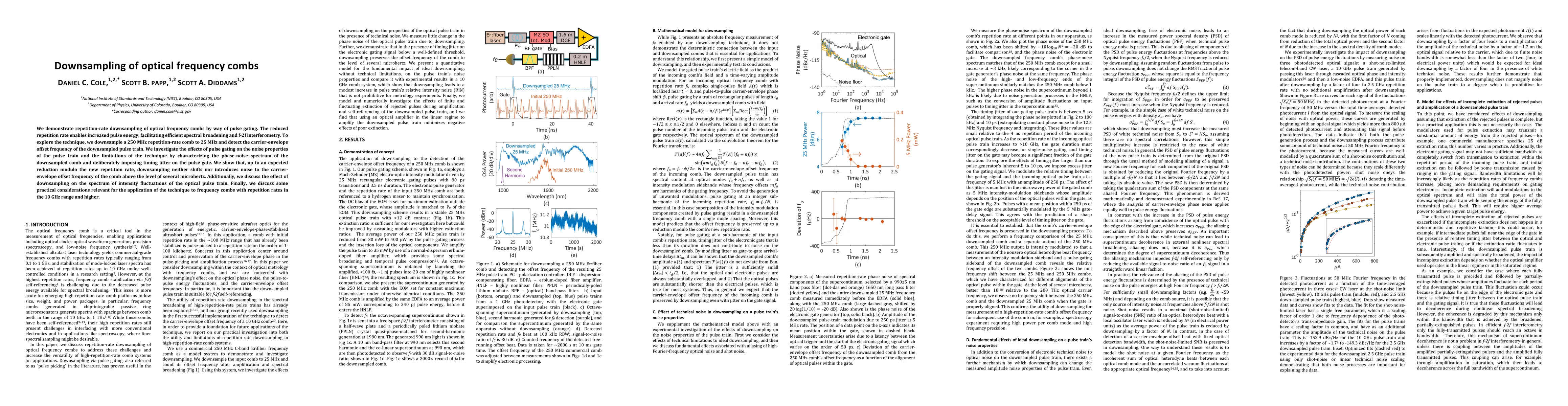 We demonstrate repetition-rate downsampling of optical frequency combs by way of pulse gating. The reduced repetition rate enables increased pulse energy, facilitating efficient spectral broadening and f-2f interferometry. To explore the technique, we downsample a 250 MHz repetition-rate comb to 25 MHz and detect the carrier-envelope offset frequency of the downsampled pulse train. We investigate the effects of pulse gating on the noise properties of the pulse train and the limitations of the technique by characterizing the phase-noise spectrum of the downsampled comb and deliberately imposing timing jitter on the pulse gate. We show that, up to an expected reduction modulo the new repetition rate, downsampling neither shifts nor introduces noise to the carrier-envelope offset frequency of the comb above the level of several microhertz. Additionally, we discuss the effect of downsampling on the spectrum of intensity fluctuations of the optical pulse train. Finally, we discuss some practical considerations relevant for the application of the technique to frequency combs with repetition rates in the 10 GHz range and higher.