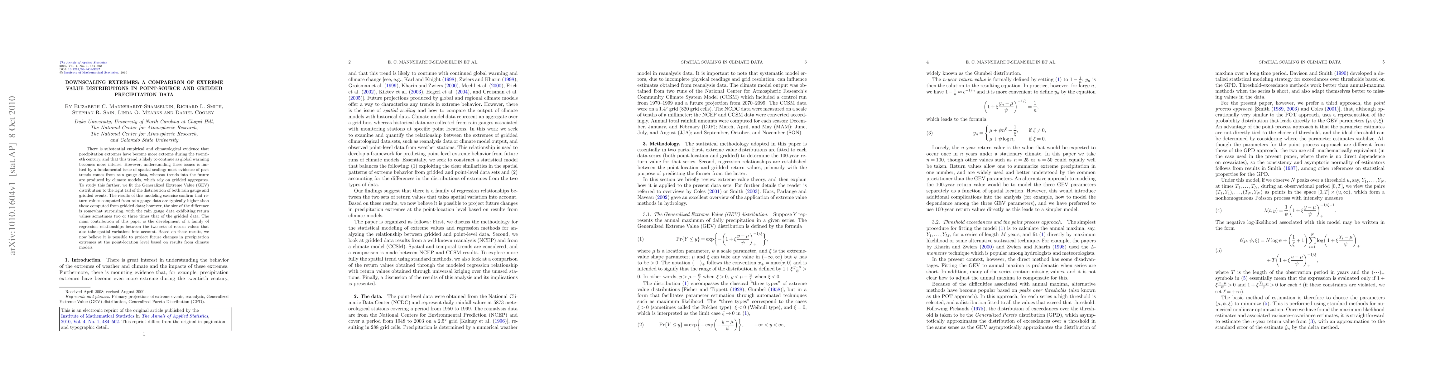There is substantial empirical and climatological evidence that precipitation extremes have become more extreme during the twentieth century, and that this trend is likely to continue as global warming becomes more intense. However, understanding these issues is limited by a fundamental issue of spatial scaling: most evidence of past trends comes from rain gauge data, whereas trends into the future are produced by climate models, which rely on gridded aggregates. To study this further, we fit the Generalized Extreme Value (GEV) distribution to the right tail of the distribution of both rain gauge and gridded events. The results of this modeling exercise confirm that return values computed from rain gauge data are typically higher than those computed from gridded data; however, the size of the difference is somewhat surprising, with the rain gauge data exhibiting return values sometimes two or three times that of the gridded data. The main contribution of this paper is the development of a family of regression relationships between the two sets of return values that also take spatial variations into account. Based on these results, we now believe it is possible to project future changes in precipitation extremes at the point-location level based on results from climate models.