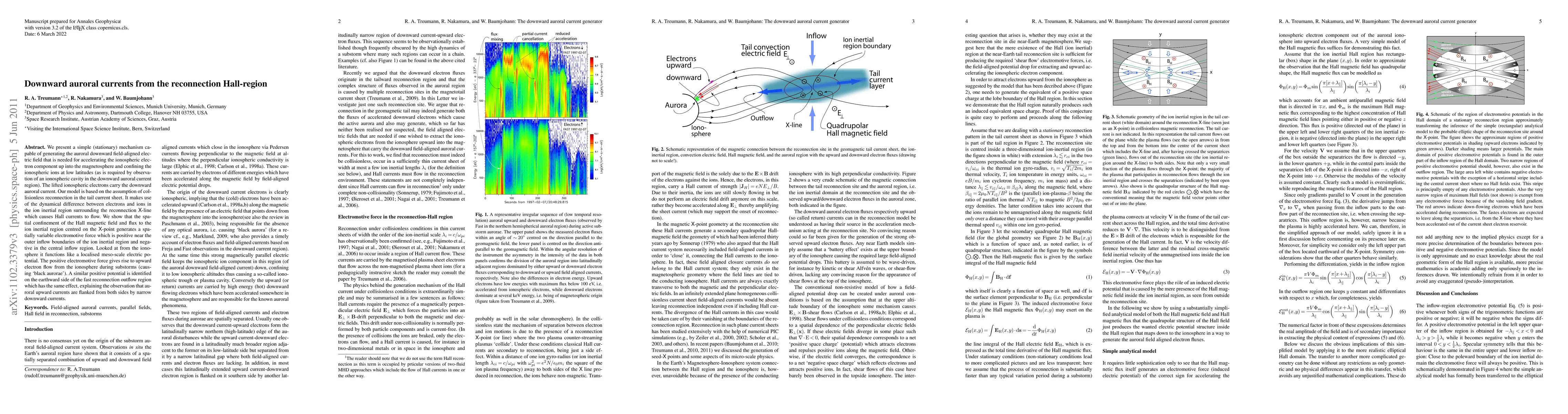 We present a simple (stationary) mechanism capable of generating the auroral downward field-aligned electric field {that is} needed for {accelerating the ionospheric electron component up into the magnetosphere and confining the ionospheric ions at low latitudes (as is required by observation of an ionospheric cavity in the downward auroral current region). The lifted ionospheric electrons carry the downward auroral current. Our model is based on the assumption of collisionless reconnection in the tail current sheet. It makes use of the dynamical difference between electrons and ions in the ion inertial region surrounding the reconnection {\sf X}-line which causes Hall currents to flow. We show that the spatial confinement of the Hall magnetic field and flux to the ion inertial region centred on the {\sf X}-point generates a spatially variable electromotive force which is positive near the outer inflow boundaries of the ion inertial region and negative in the central inflow region. Looked {at} from the ionosphere it functions like a localised meso-scale electric potential.} The positive electromotive force gives rise to upward electron flow from the ionosphere {during substorms (causing `black aurorae')}. A similar positive potential is identified on the earthward side of the fast reconnection outflow region which has the same effect, explaining the observation that auroral upward currents are flanked from both sides by narrow downward currents. keywords{Field-aligned auroral currents, parallel fields, Hall field in reconnection, substorms}