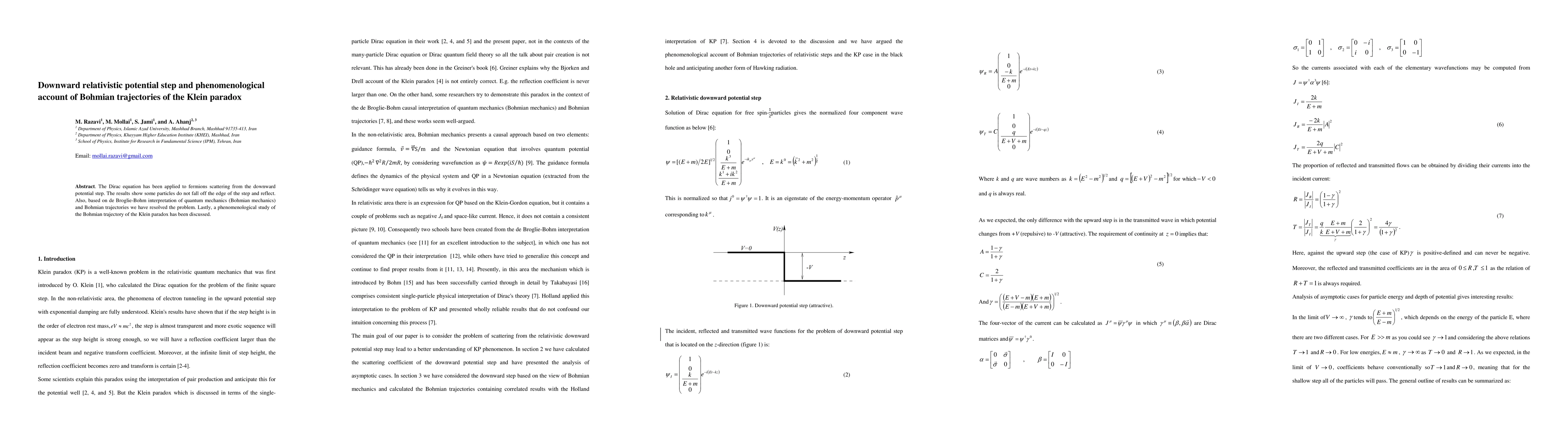 The paper investigates fermions scattering from a downward relativistic potential step using the Dirac equation, revealing particles that reflect rather than fall off. It resolves the Klein paradox through Bohmian mechanics, providing a phenomenological account of the associated Bohmian trajectories.