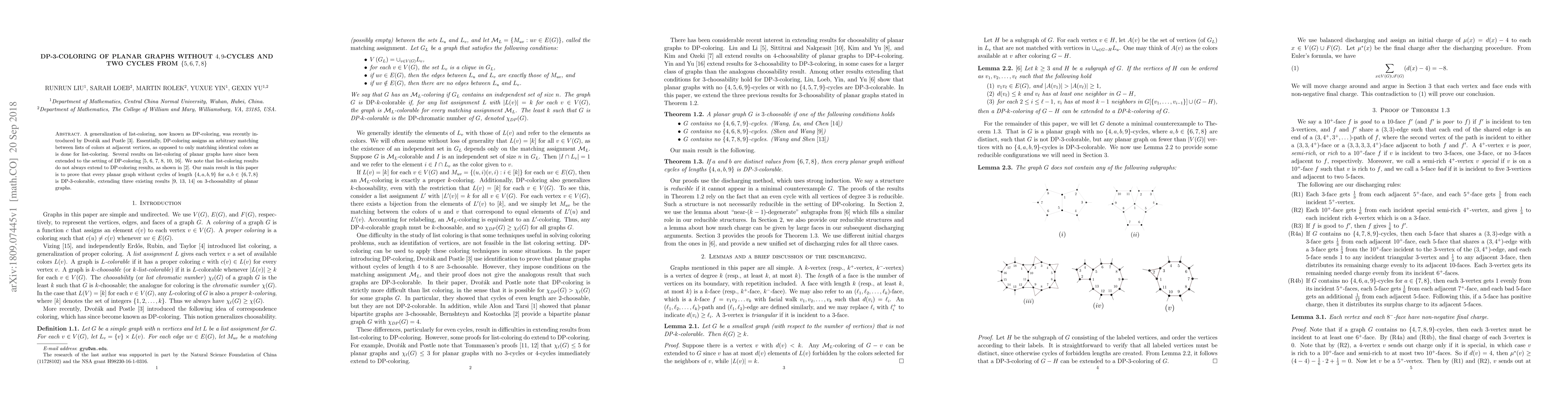 This paper extends results on DP-coloring of planar graphs by proving that any planar graph devoid of cycles of lengths 4, 9, and two cycles from {5, 6, 7, 8} is DP-3-colorable, thereby generalizing existing findings on list-coloring.