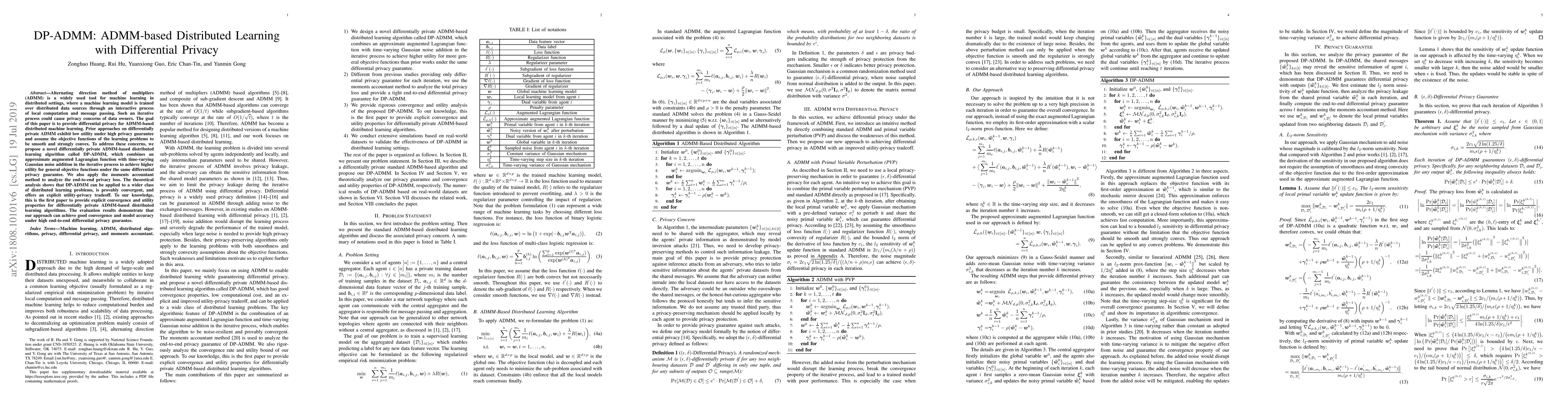 This paper introduces DP-ADMM, a novel differentially private ADMM-based distributed learning algorithm that combines an approximate augmented Lagrangian function with time-varying Gaussian noise to achieve higher utility for general objective functions while maintaining high privacy guarantees. The method is shown to be provably convergent and offers an explicit utility-privacy tradeoff.