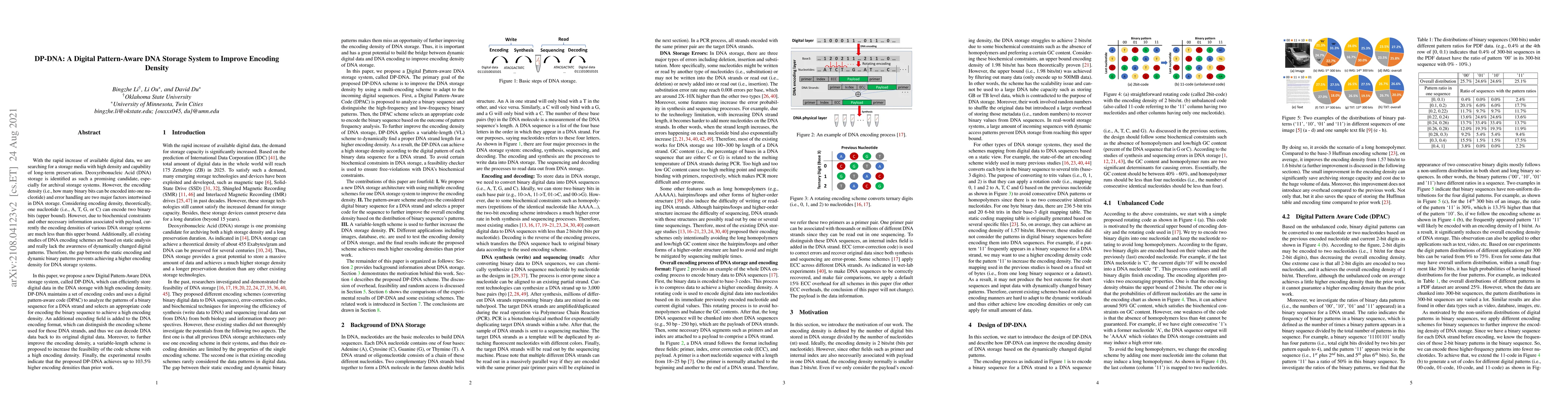 The DP-DNA system proposes a new digital pattern-aware DNA storage method to enhance encoding density by dynamically analyzing binary sequences and selecting optimal encoding codes. Experimental results show DP-DNA achieves up to 103.5% higher encoding densities compared to previous methods.