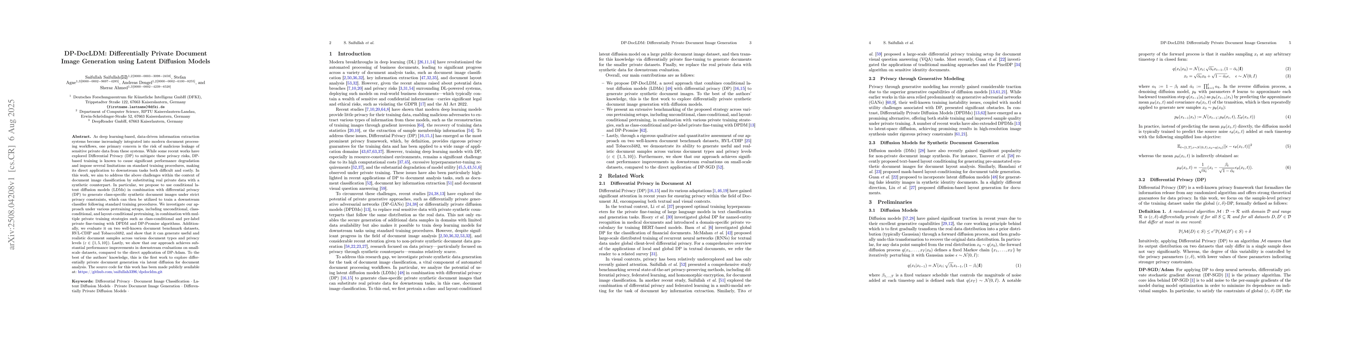 As deep learning-based, data-driven information extraction systems become increasingly integrated into modern document processing workflows, one primary concern is the risk of malicious leakage of sensitive private data from these systems. While some recent works have explored Differential Privacy (DP) to mitigate these privacy risks, DP-based training is known to cause significant performance degradation and impose several limitations on standard training procedures, making its direct application to downstream tasks both difficult and costly. In this work, we aim to address the above challenges within the context of document image classification by substituting real private data with a synthetic counterpart. In particular, we propose to use conditional latent diffusion models (LDMs) in combination with differential privacy (DP) to generate class-specific synthetic document images under strict privacy constraints, which can then be utilized to train a downstream classifier following standard training procedures. We investigate our approach under various pretraining setups, including unconditional, class-conditional, and layout-conditional pretraining, in combination with multiple private training strategies such as class-conditional and per-label private fine-tuning with DPDM and DP-Promise algorithms. Additionally, we evaluate it on two well-known document benchmark datasets, RVL-CDIP and Tobacco3482, and show that it can generate useful and realistic document samples across various document types and privacy levels ($\varepsilon \in \{1, 5, 10\}$). Lastly, we show that our approach achieves substantial performance improvements in downstream evaluations on small-scale datasets, compared to the direct application of DP-Adam.