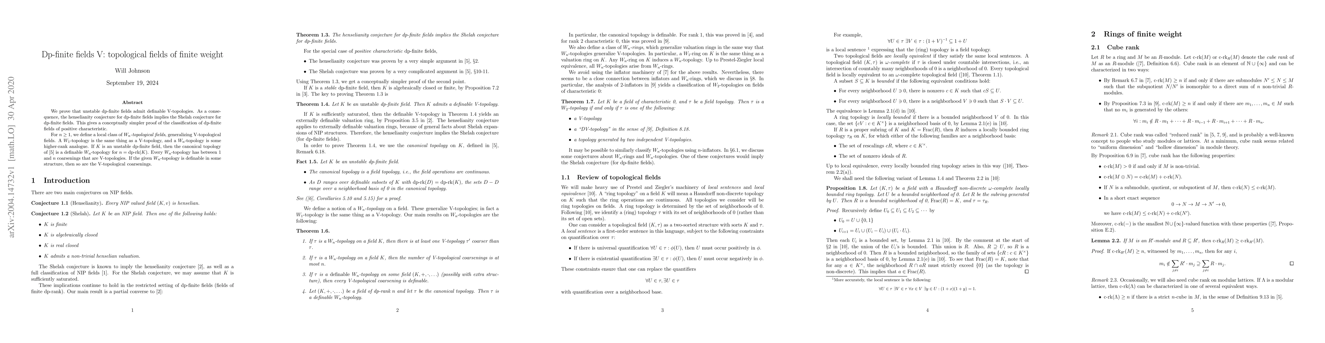 We prove that unstable dp-finite fields admit definable V-topologies. As a consequence, the henselianity conjecture for dp-finite fields implies the Shelah conjecture for dp-finite fields. This gives a conceptually simpler proof of the classification of dp-finite fields of positive characteristic. For $n \ge 1$, we define a local class of "$W_n$-topological fields", generalizing V-topological fields. A $W_1$-topology is the same thing as a V-topology, and a $W_n$-topology is some higher-rank analogue. If $K$ is an unstable dp-finite field, then the canonical topology is a definable $W_n$-topology for $n = \operatorname{dp-rk}(K)$. Every $W_n$-topology has between 1 and $n$ coarsenings that are V-topologies. If the given $W_n$-topology is definable in some structure, then so are the V-topological coarsenings.