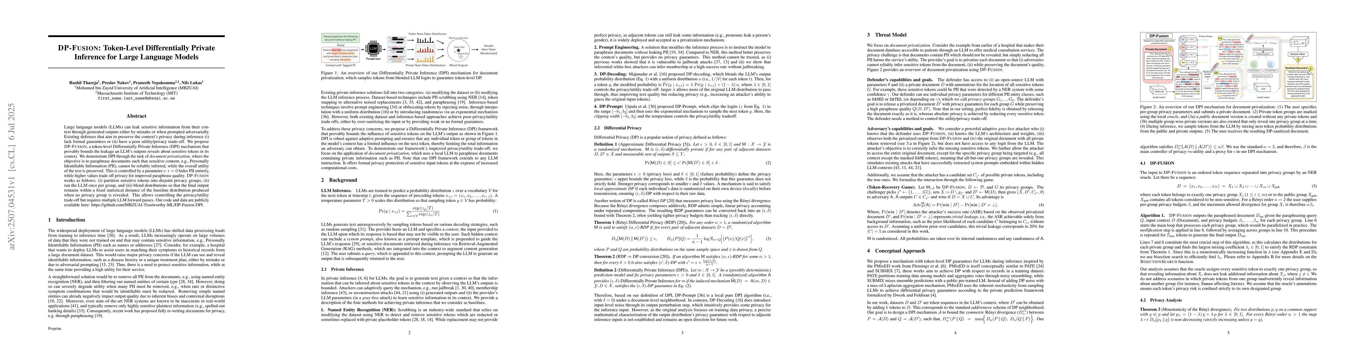 Large language models (LLMs) can leak sensitive information from their context through generated outputs, either accidentally or when prompted adversarially. Existing defenses that aim to preserve context privacy during inference either lack formal guarantees or suffer from a poor utility/privacy trade-off. We propose DP-Fusion, a token-level Differentially Private Inference (DPI) mechanism that provably bounds how much an LLM's outputs reveal about sensitive tokens in its context. We demonstrate DPI through the task of document privatization, where the goal is to paraphrase documents so that sensitive content (e.g., Personally Identifiable Information, PII) cannot be reliably inferred, while still preserving the overall utility of the text. This is controlled by a parameter $\epsilon$: $\epsilon=0$ hides PII entirely, while higher values trade off privacy for improved paraphrase quality. DP-Fusion works as follows: (i) partition sensitive tokens into disjoint privacy groups, (ii) run the LLM once per group, and (iii) blend the output distributions so that the final output remains within a fixed statistical distance of the baseline distribution produced when no privacy group is revealed. This approach allows fine-grained control over the privacy/utility trade-off but requires multiple LLM forward passes.
