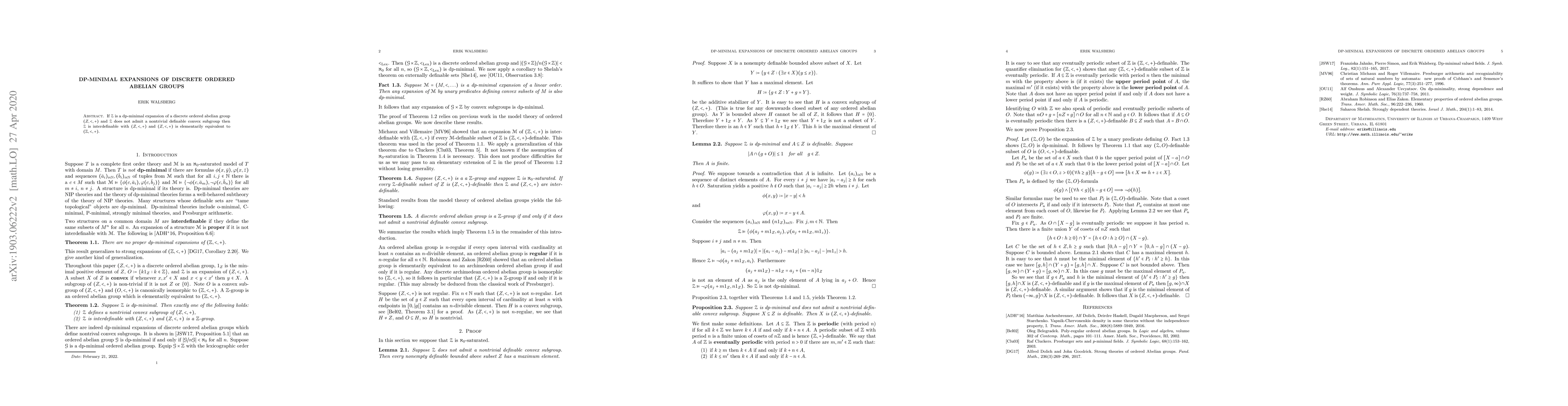 A discrete ordered abelian group that is dp-minimal and does not have a nontrivial definable convex subgroup is interdefinable with the original group and elementarily equivalent to the integers.