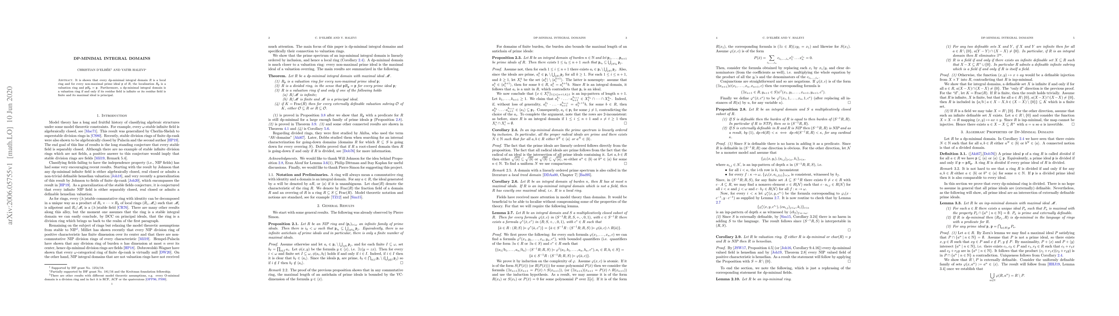 Summary: This paper demonstrates that dp-minimal integral domains are local rings where non-maximal prime ideals localize to valuation rings, and it establishes that such domains are valuation rings if their residue fields are infinite or if they have finite residue fields with principal maximal ideals.