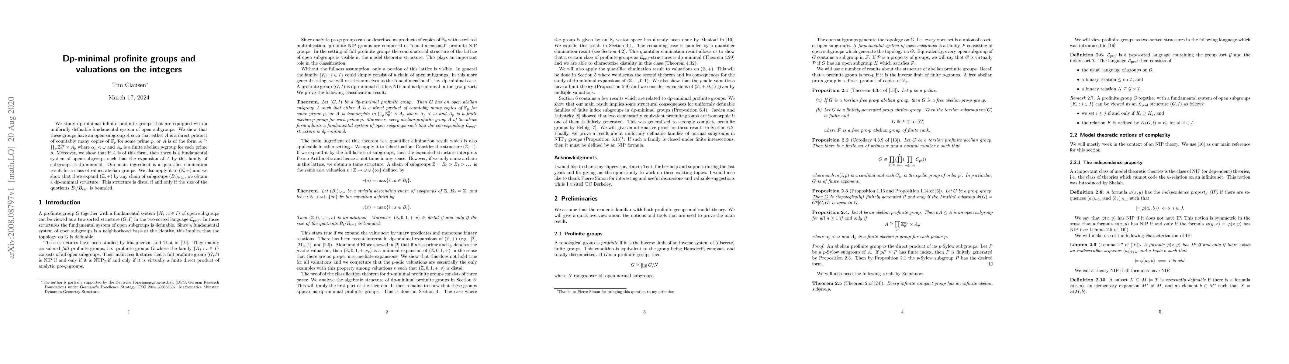 We study dp-minimal infinite profinite groups that are equipped with a uniformly definable fundamental system of open subgroups. We show that these groups have an open subgroup $A$ such that either $A$ is a direct product of countably many copies of $\mathbb{F}_p$ for some prime $p$, or $A$ is of the form $A \cong \prod_p \mathbb{Z}_p^{\alpha_p} \times A_p$ where $\alpha_p < \omega$ and $A_p$ is a finite abelian $p$-group for each prime $p$. Moreover, we show that if $A$ is of this form, then there is a fundamental system of open subgroups such that the expansion of $A$ by this family of subgroups is dp-minimal. Our main ingredient is a quantifier elimination result for a class of valued abelian groups. We also apply it to $(\mathbb{Z},+)$ and we show that if we expand $(\mathbb{Z},+)$ by any chain of subgroups $(B_i)_{i<\omega}$, we obtain a dp-minimal structure. This structure is distal if and only if the size of the quotients $B_i/B_{i+1}$ is bounded.