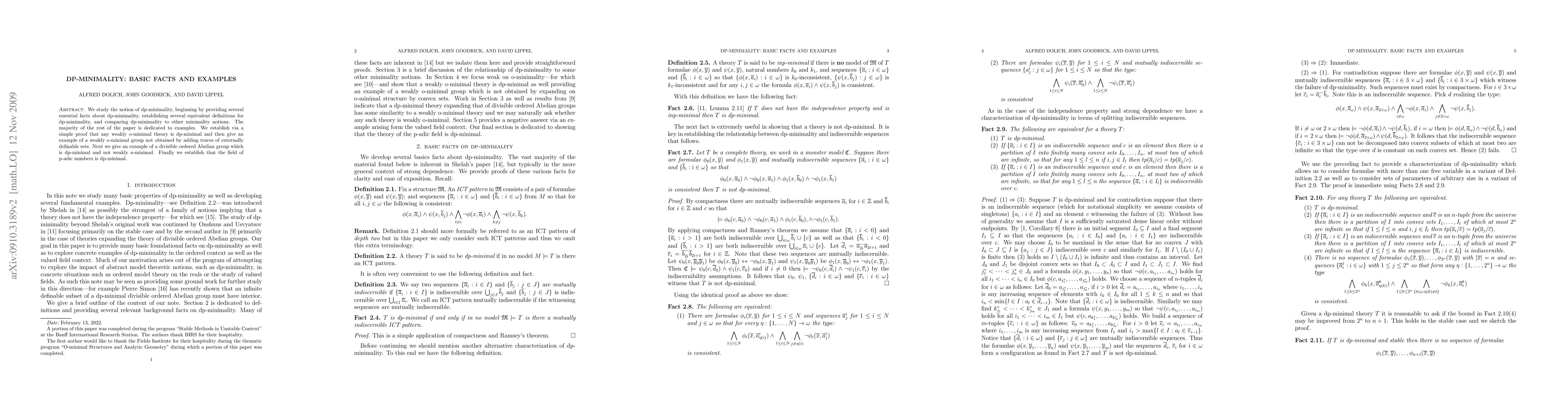 This paper explores the concept of dp-minimality, establishing its equivalent definitions and comparing it to other minimality notions. It demonstrates that any weakly o-minimal theory is dp-minimal and provides examples of dp-minimal structures, including a weakly o-minimal group and a divisible ordered Abelian group that is dp-minimal but not weakly o-minimal, concluding with the dp-minimality of the field of p-adic numbers.