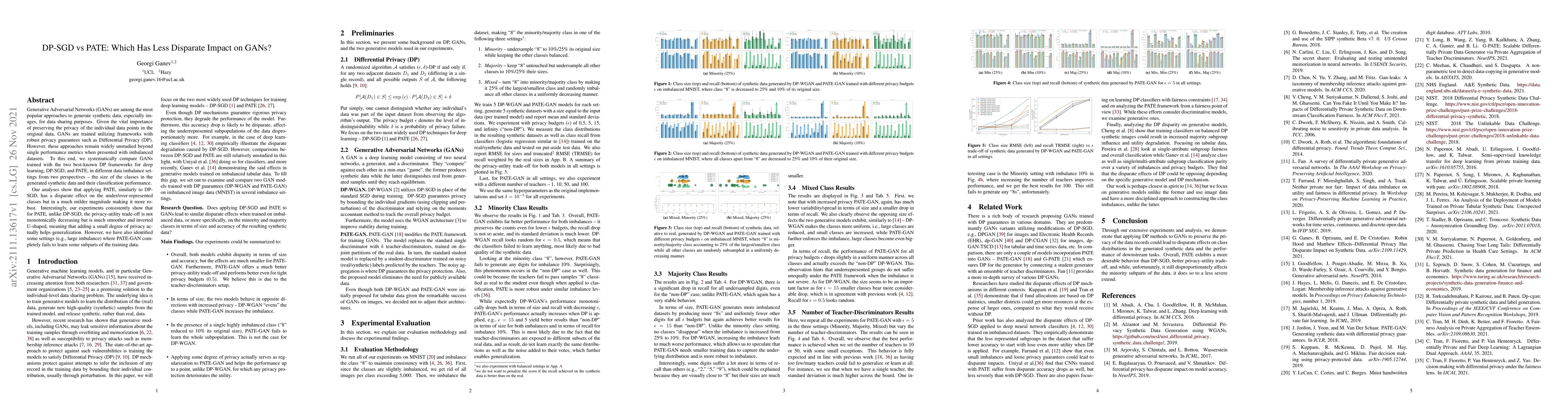 This paper compares DP-SGD and PATE in training GANs for synthetic data generation, focusing on their disparate impact on class representation and performance. PATE shows milder disparate effects and a smoother privacy-utility trade-off, though it fails in highly imbalanced settings.