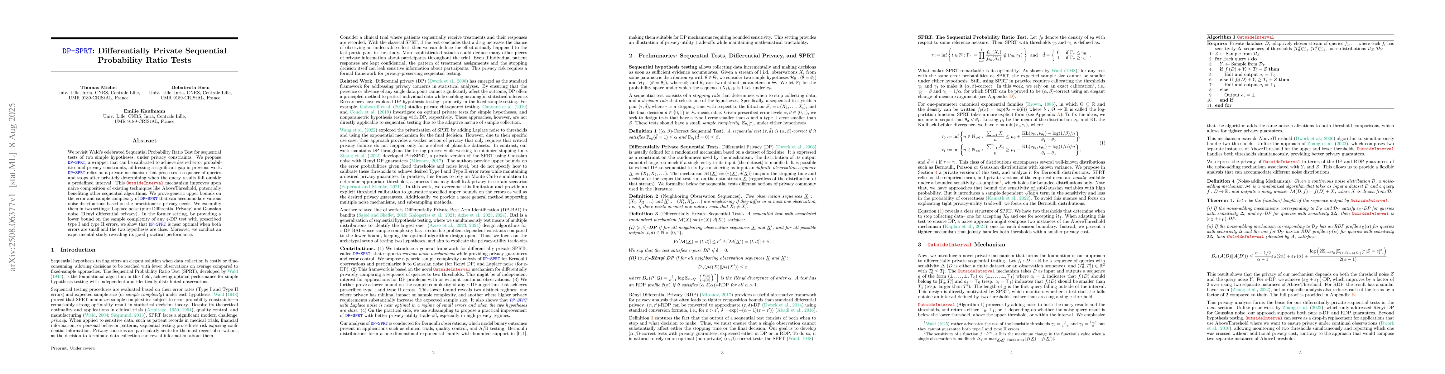The paper proposes DP-SPRT, a differentially private sequential probability ratio test, which wraps around existing sequential probability ratio tests to meet privacy constraints. It introduces the OutsideInterval mechanism for processing sequences of queries privately and stopping when results fall outside a predefined interval, improving upon naive composition of existing techniques.
