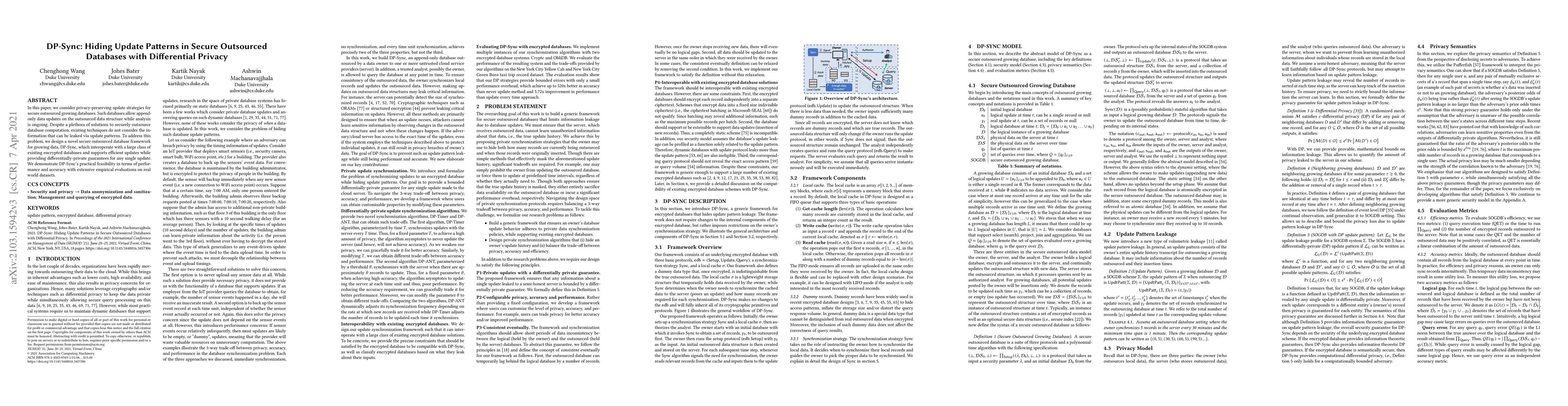 DP-Sync introduces a novel framework to protect update pattern leakage in secure outsourced databases using differential privacy. It formalizes the concept and security model, ensuring data update history confidentiality through differentially-private strategies for data synchronization.