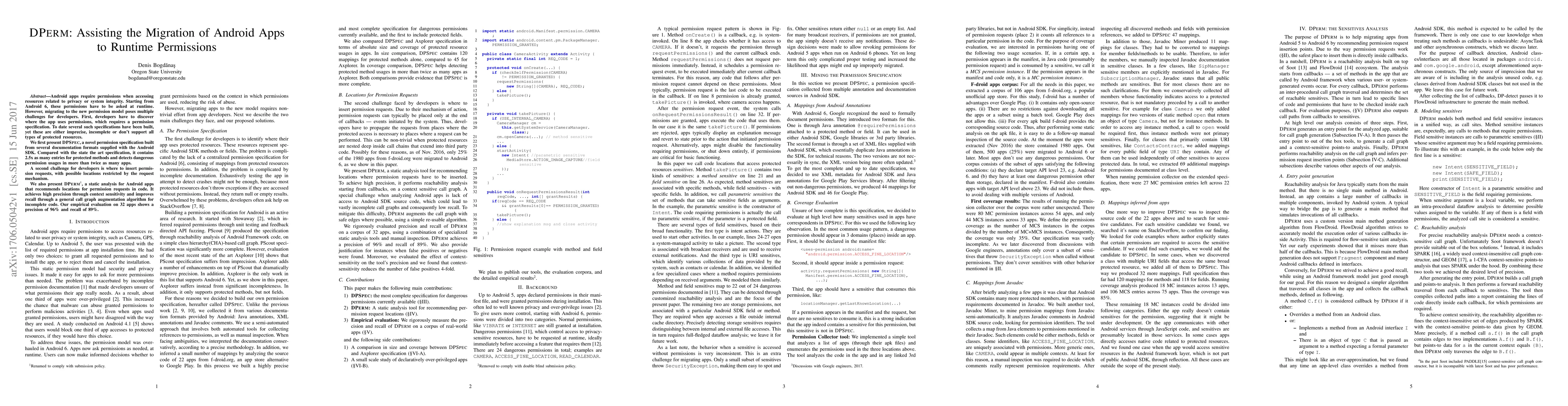 DPerm assists developers in migrating Android apps to runtime permissions by providing a novel permission specification, DPSpec, and a static analysis tool, DPerm, to recommend optimal locations for permission requests, achieving high precision and recall.