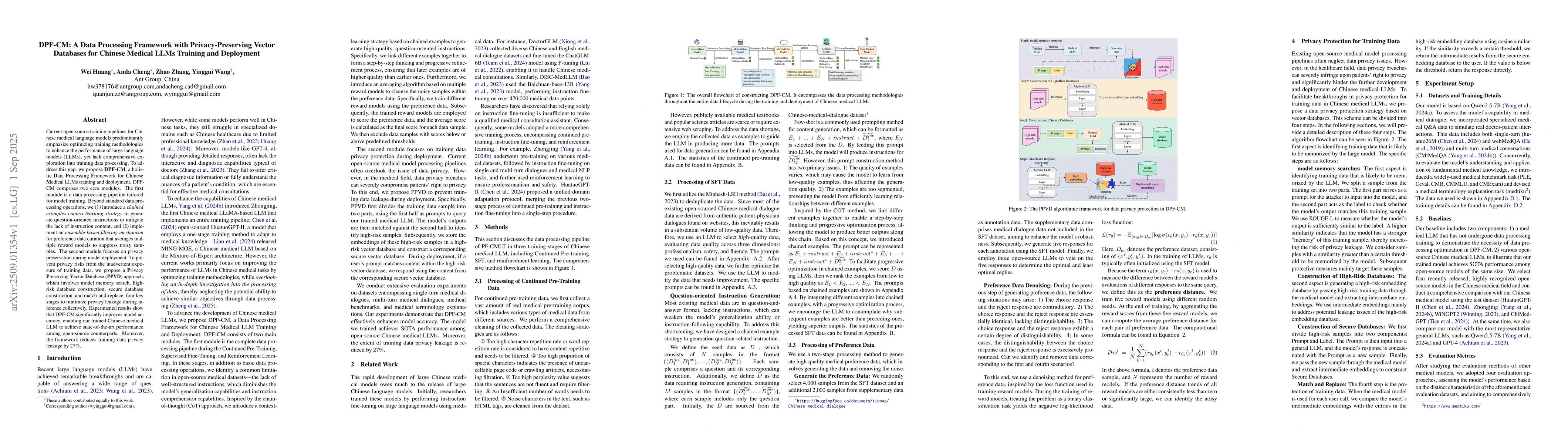 Current open-source training pipelines for Chinese medical language models predominantly emphasize optimizing training methodologies to enhance the performance of large language models (LLMs), yet lack comprehensive exploration into training data processing. To address this gap, we propose DPF-CM, a holistic Data Processing Framework for Chinese Medical LLMs training and deployment. DPF-CM comprises two core modules. The first module is a data processing pipeline tailored for model training. Beyond standard data processing operations, we (1) introduce a chained examples context-learning strategy to generate question-oriented instructions to mitigate the lack of instruction content, and (2) implement an ensemble-based filtering mechanism for preference data curation that averages multiple reward models to suppress noisy samples. The second module focuses on privacy preservation during model deployment. To prevent privacy risks from the inadvertent exposure of training data, we propose a Privacy Preserving Vector Database (PPVD) approach, which involves model memory search, high-risk database construction, secure database construction, and match-and-replace, four key stages to minimize privacy leakage during inference collectively. Experimental results show that DPF-CM significantly improves model accuracy, enabling our trained Chinese medical LLM to achieve state-of-the-art performance among open-source counterparts. Moreover, the framework reduces training data privacy leakage by 27%.