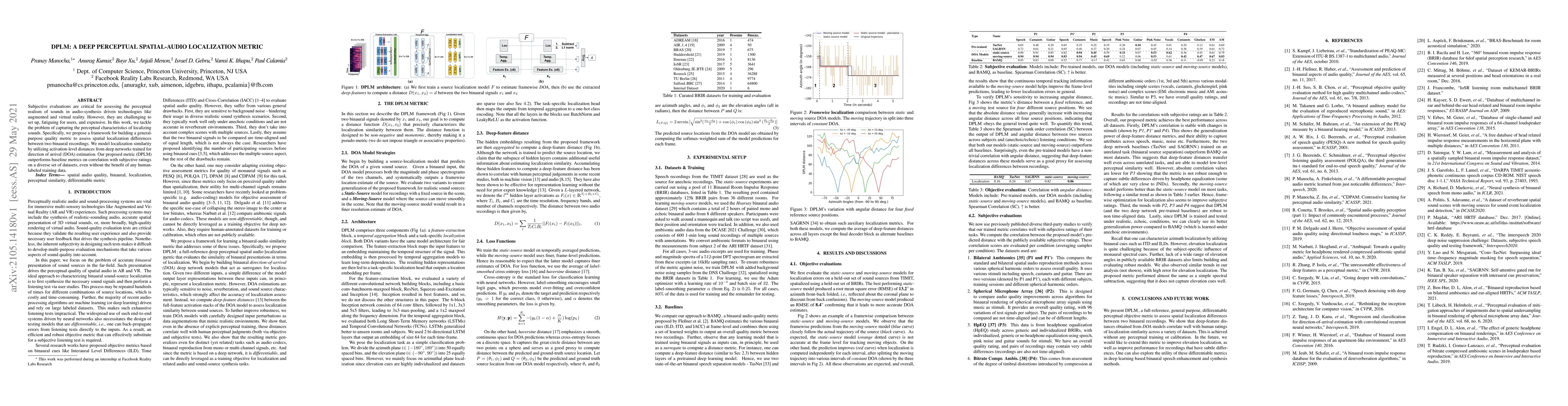 The paper proposes DPLM, a deep perceptual spatial-audio localization metric, to assess spatial localization differences between binaural recordings. It outperforms baseline metrics by correlating better with subjective ratings, leveraging deep networks trained for direction of arrival estimation without human-labeled data.