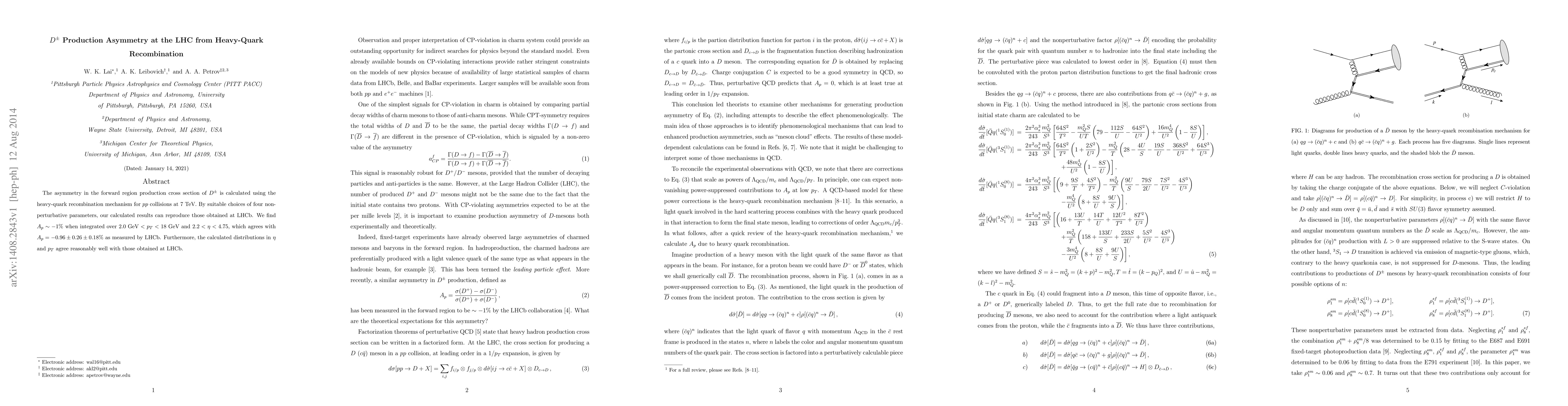 The asymmetry in the forward region production cross section of D^\pm is calculated using the heavy-quark recombination mechanism for pp collisions at 7 TeV. By suitable choices of four non-perturbative parameters, our calculated results can reproduce those obtained at LHCb. We find A_p ~ -1% when integrated over 2.0 GeV < p_T < 18 GeV and 2.2< eta <4.75, which agrees with A_p=-0.96\pm0.26\pm0.18% as measured by LHCb. Furthermore, the calculated distributions in eta and p_T agree reasonably well with those obtained at LHCb.