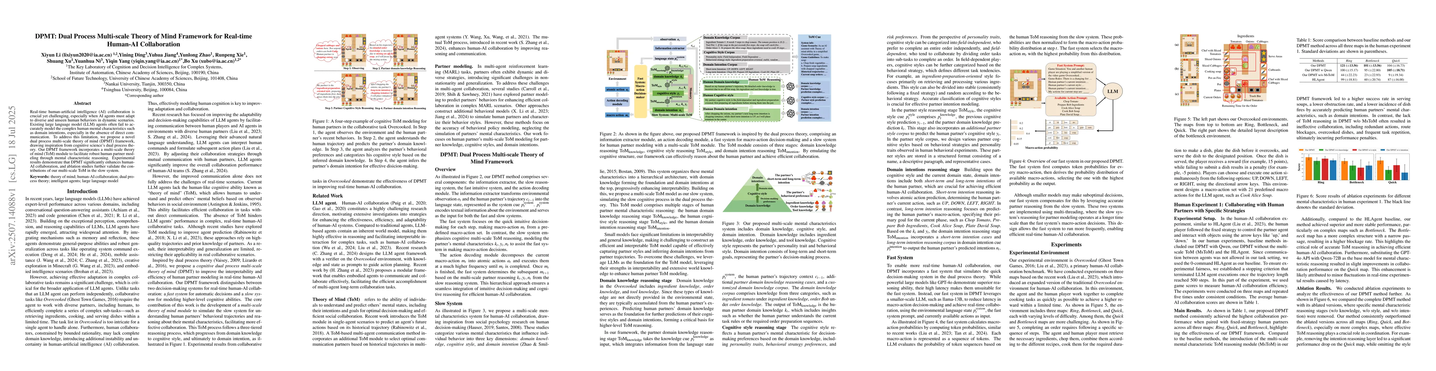 Real-time human-artificial intelligence (AI) collaboration is crucial yet challenging, especially when AI agents must adapt to diverse and unseen human behaviors in dynamic scenarios. Existing large language model (LLM) agents often fail to accurately model the complex human mental characteristics such as domain intentions, especially in the absence of direct communication. To address this limitation, we propose a novel dual process multi-scale theory of mind (DPMT) framework, drawing inspiration from cognitive science dual process theory. Our DPMT framework incorporates a multi-scale theory of mind (ToM) module to facilitate robust human partner modeling through mental characteristic reasoning. Experimental results demonstrate that DPMT significantly enhances human-AI collaboration, and ablation studies further validate the contributions of our multi-scale ToM in the slow system.