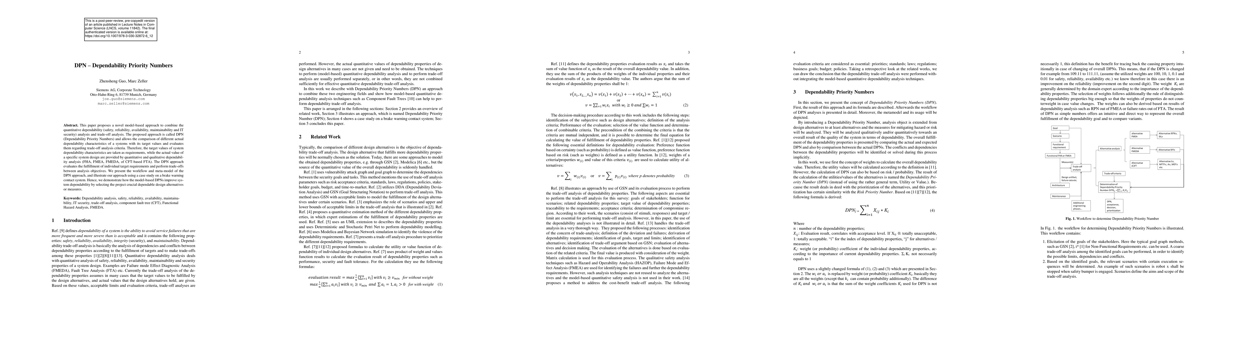 This paper proposes a novel model-based approach to combine the quantitative dependability (safety, reliability, availability, maintainability and IT security) analysis and trade-off analysis. The proposed approach is called DPN (Dependability Priority Numbers) and allows the comparison of different actual dependability characteristics of a systems with its target values and evaluates them regarding trade-off analysis criteria. Therefore, the target values of system dependability characteristics are taken as requirements, while the actual value of a specific system design are provided by quantitative and qualitative dependability analysis (FHA, FMEA, FMEDA, of CFT-based FTA). The DPN approach evaluates the fulfillment of individual target requirements and perform trade-offs between analysis objectives. We present the workflow and meta-model of the DPN approach, and illustrate our approach using a case study on a brake warning contact system. Hence, we demonstrate how the model-based DPNs improve system dependability by selecting the project crucial dependable design alternatives or measures.