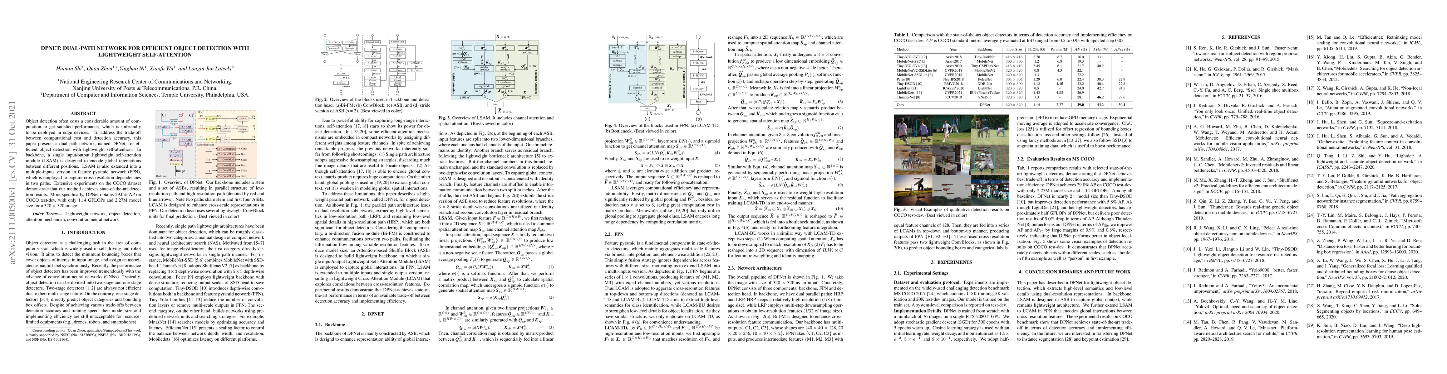 DPNet introduces a dual-path network with lightweight self-attention to achieve efficient object detection suitable for edge devices. The proposed single input/output lightweight self-attention module (LSAM) and its extended version in the feature pyramid network (FPN) enable high accuracy with minimal computational cost.