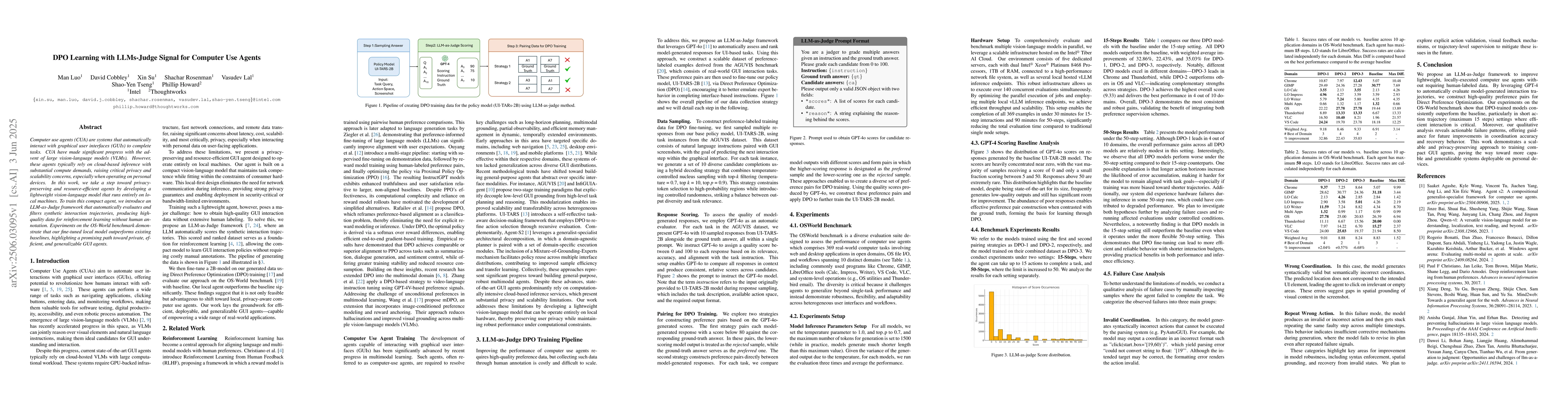 The introduction of an LLM-as-Judge framework for training a compact, privacy-preserving vision-language model that runs locally on machines for GUI agent tasks.
