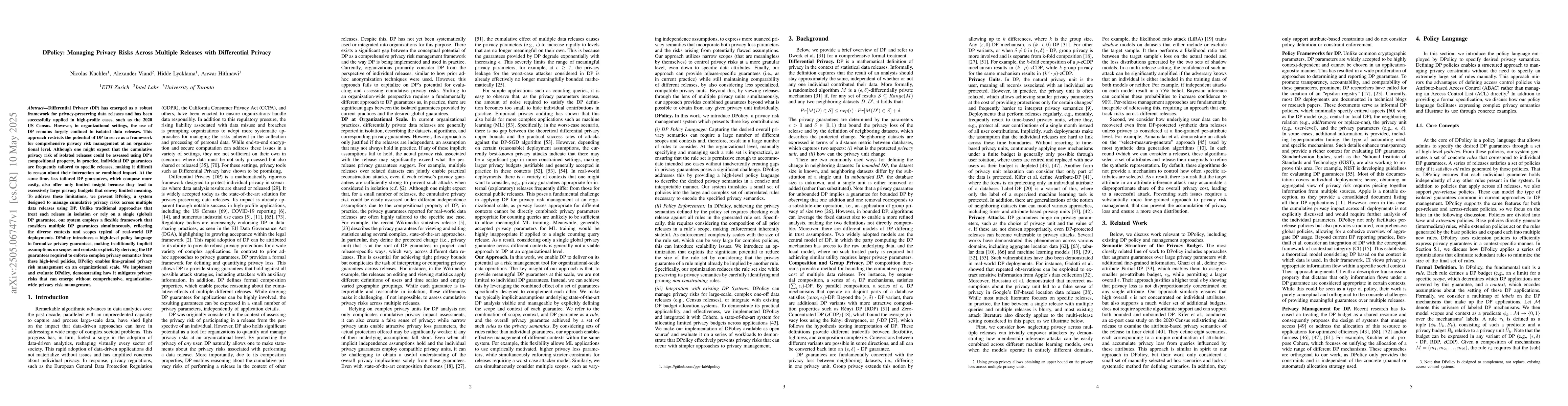 The paper presents DPolicy, a system designed to manage cumulative privacy risks across multiple data releases using Differential Privacy (DP). It introduces a high-level policy language to formalize privacy guarantees, enabling fine-grained privacy risk management on an organizational scale.
