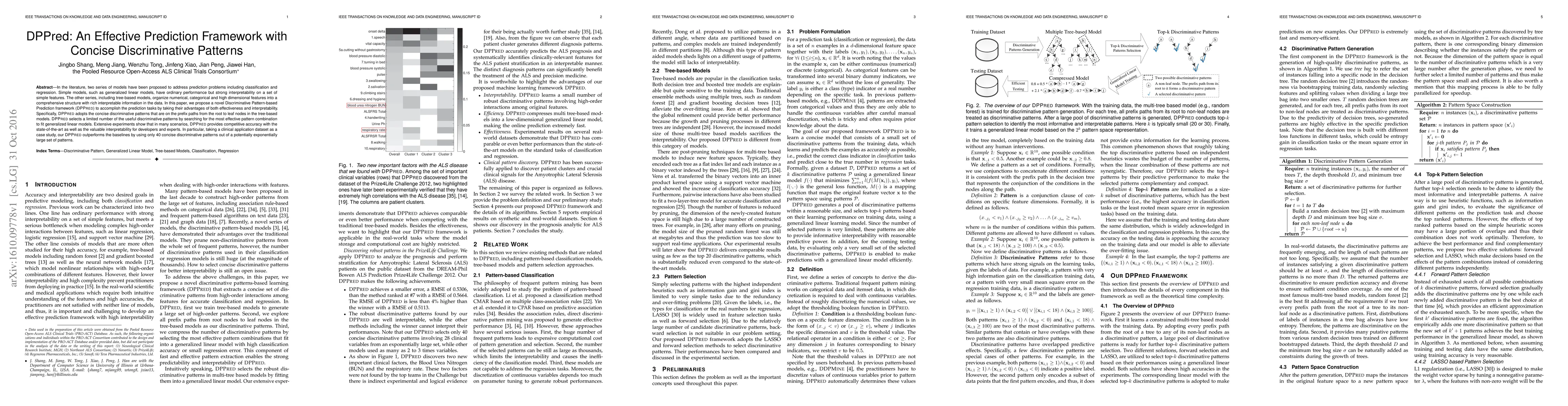 In the literature, two series of models have been proposed to address prediction problems including classification and regression. Simple models, such as generalized linear models, have ordinary performance but strong interpretability on a set of simple features. The other series, including tree-based models, organize numerical, categorical and high dimensional features into a comprehensive structure with rich interpretable information in the data. In this paper, we propose a novel Discriminative Pattern-based Prediction framework (DPPred) to accomplish the prediction tasks by taking their advantages of both effectiveness and interpretability. Specifically, DPPred adopts the concise discriminative patterns that are on the prefix paths from the root to leaf nodes in the tree-based models. DPPred selects a limited number of the useful discriminative patterns by searching for the most effective pattern combination to fit generalized linear models. Extensive experiments show that in many scenarios, DPPred provides competitive accuracy with the state-of-the-art as well as the valuable interpretability for developers and experts. In particular, taking a clinical application dataset as a case study, our DPPred outperforms the baselines by using only 40 concise discriminative patterns out of a potentially exponentially large set of patterns.